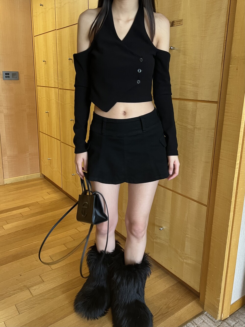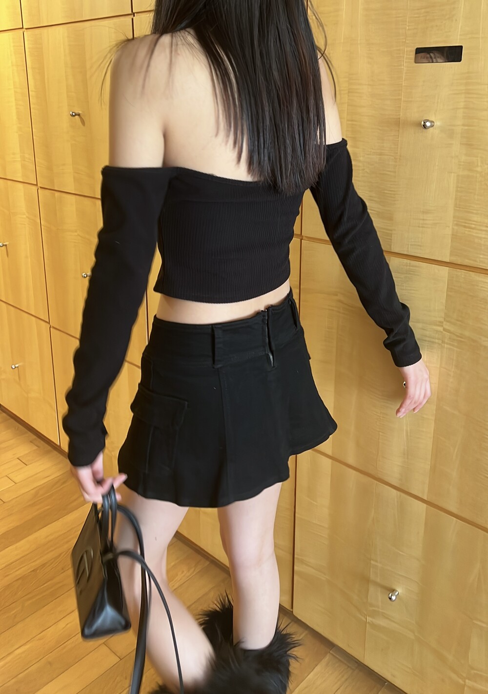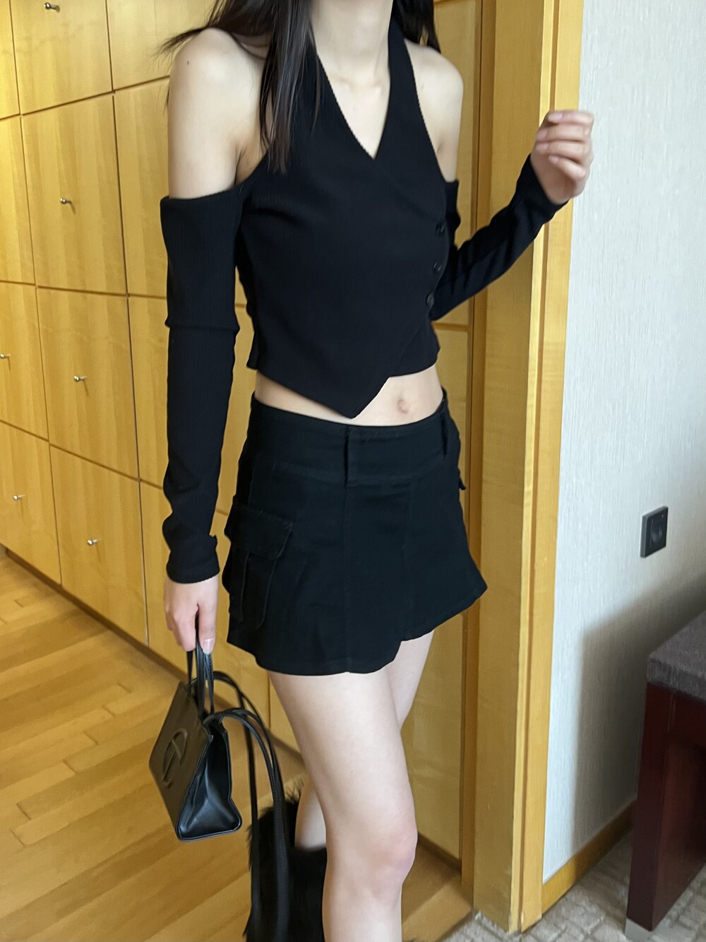 홀터넥과 오프 숄더 디테일로 페미닌하면서 유니크함을 더해
