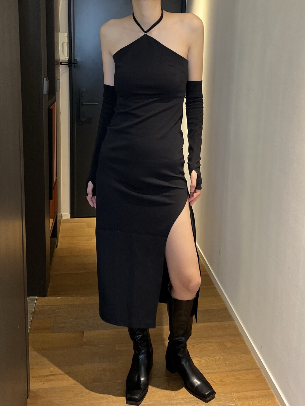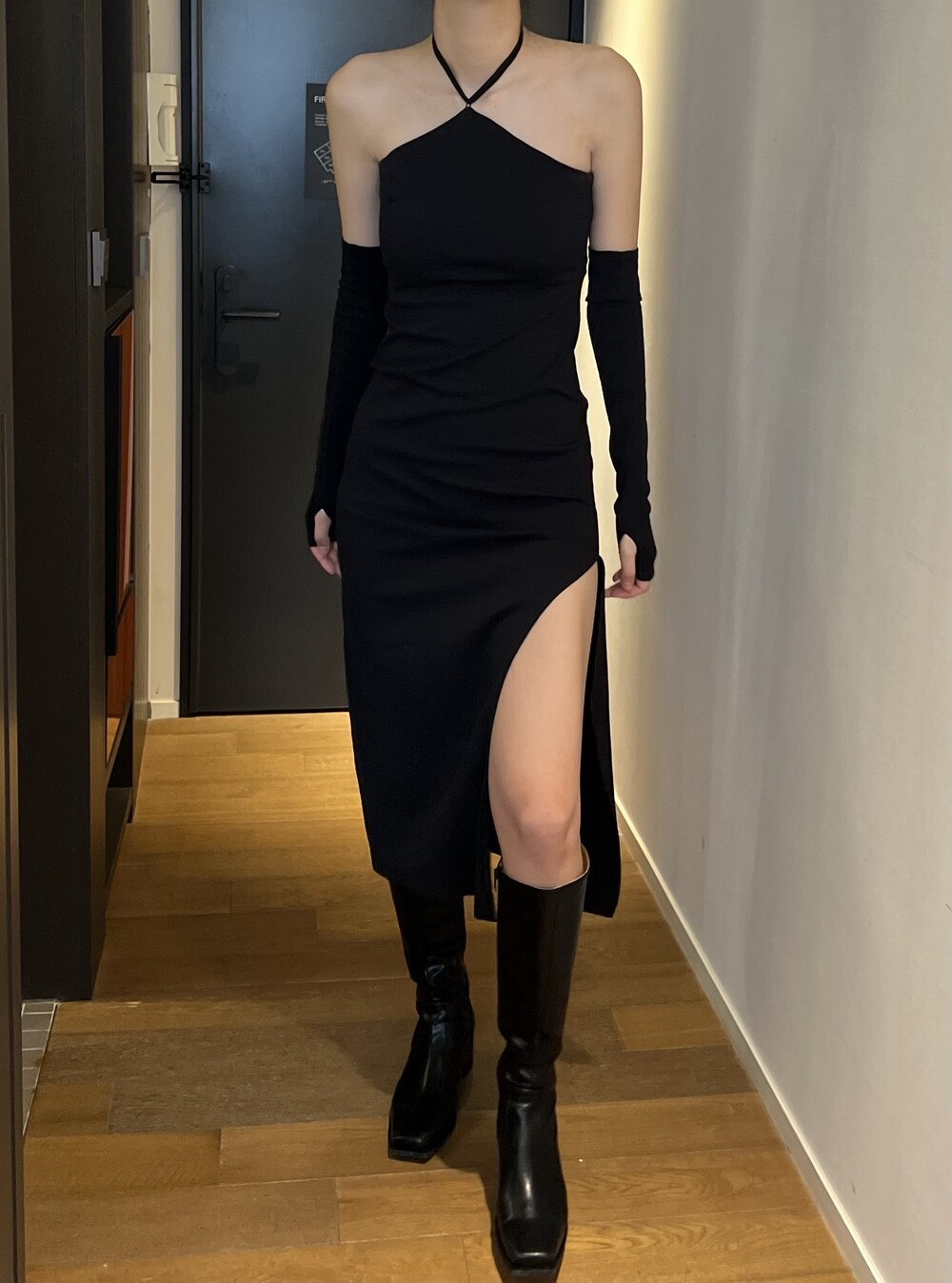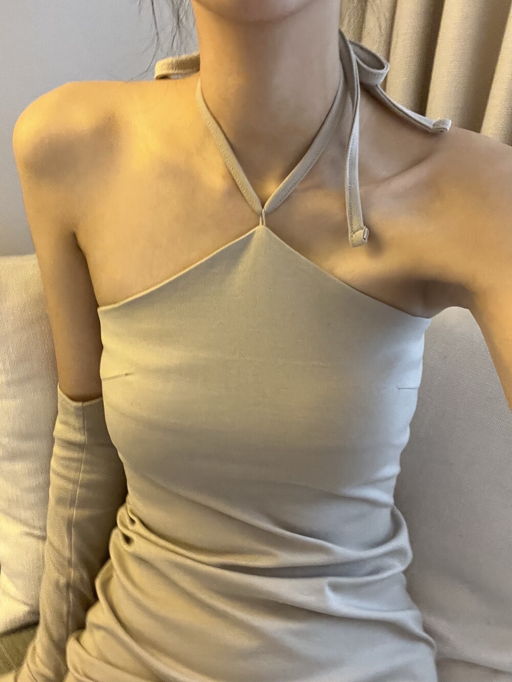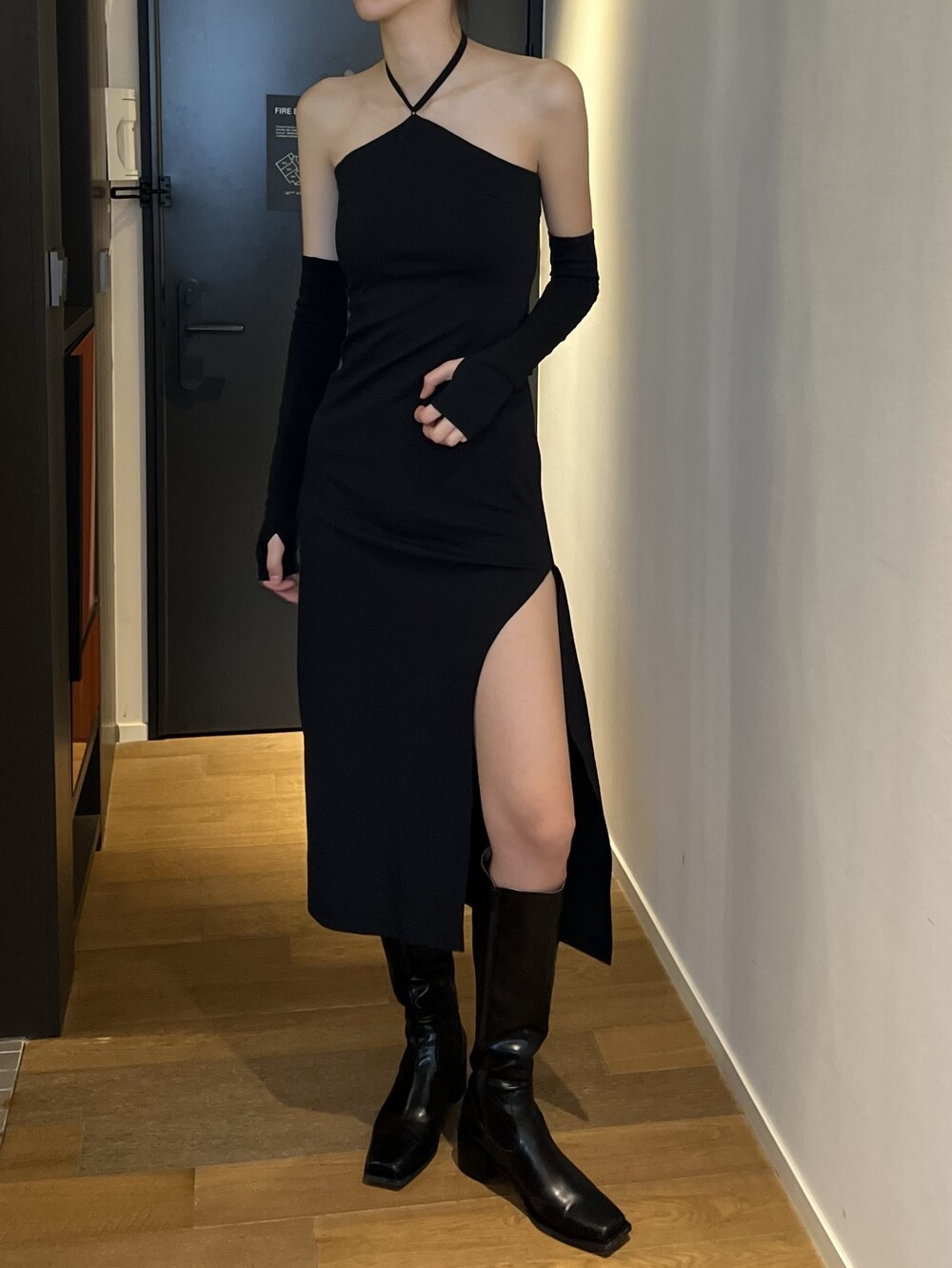 전체적으로 슬림하게 잡아주는 핏이라 허리라인을 날씬하게 잡아주고, 홀터 넥 스트랩으로 어깨 라인까지 전체적으로 페미닌하면서 시크하게 강조할 수 있는 포인트가 돋보이는 아이템입니다.