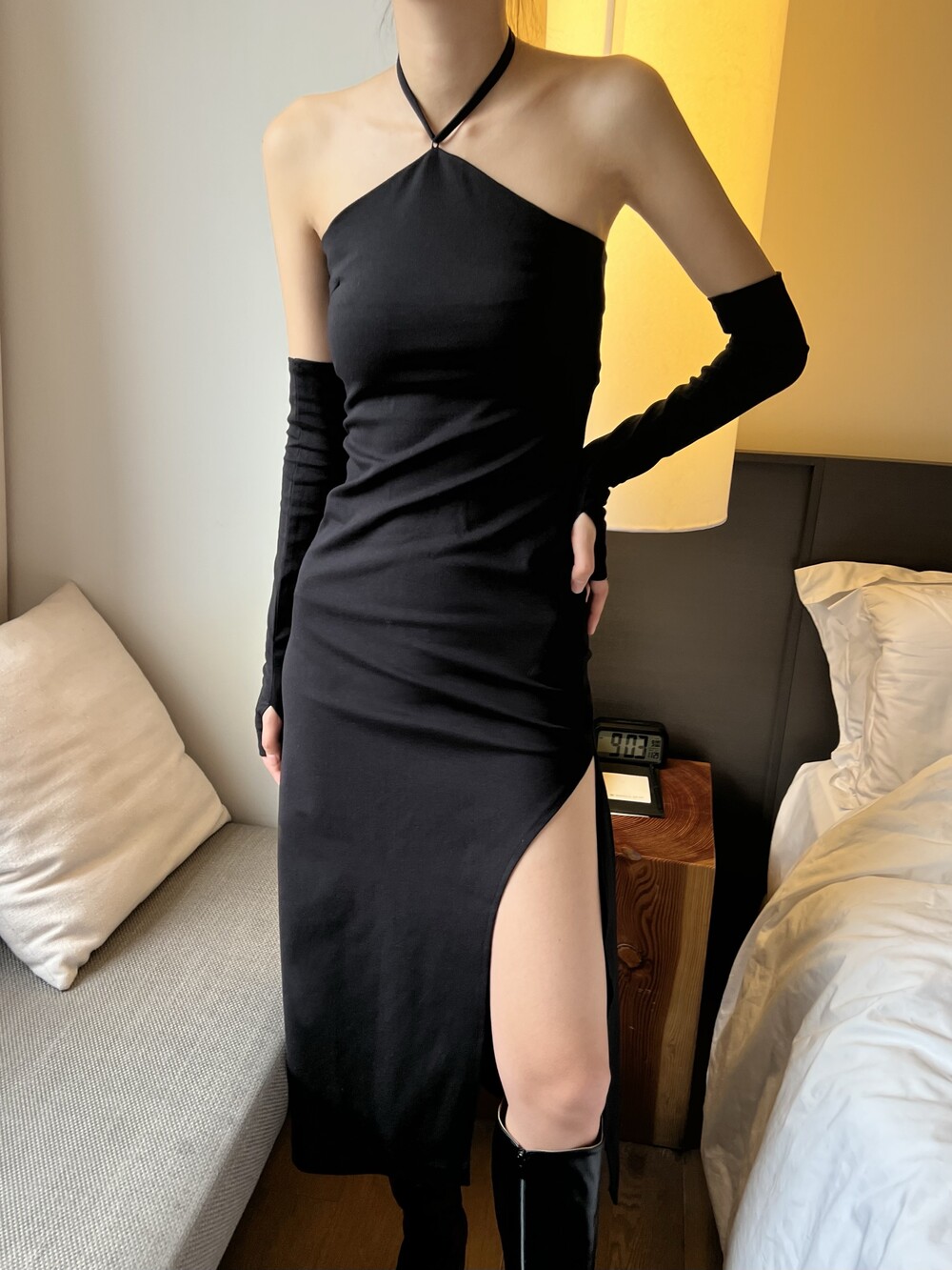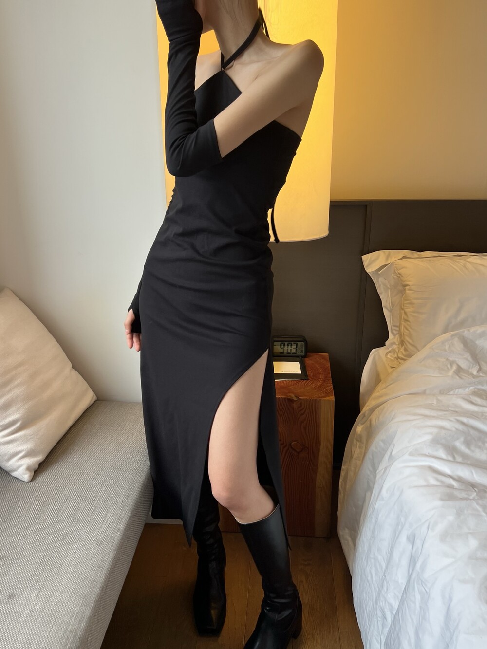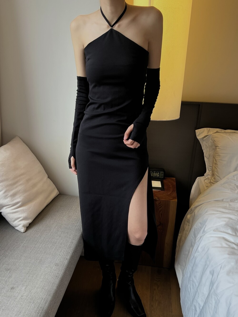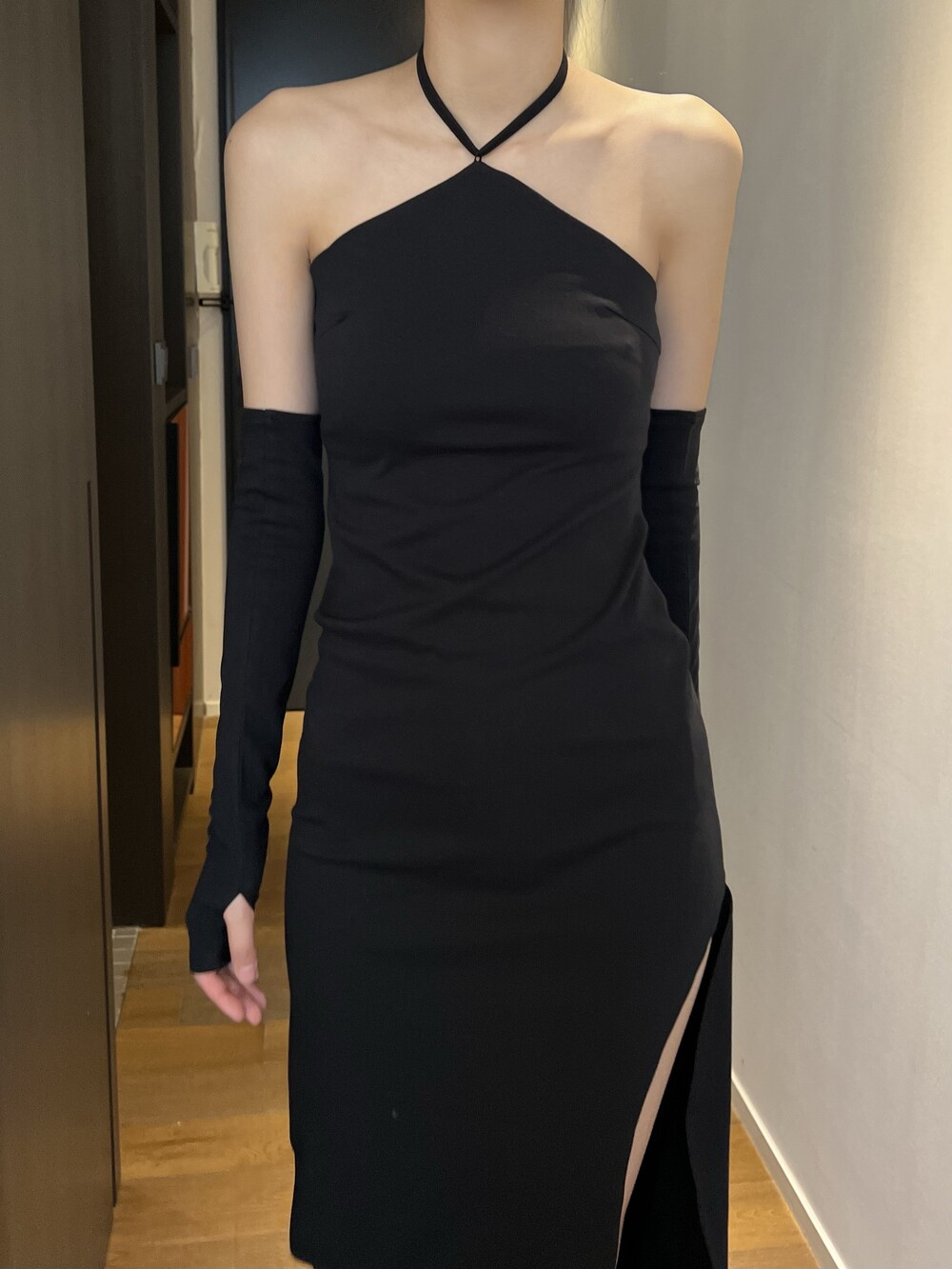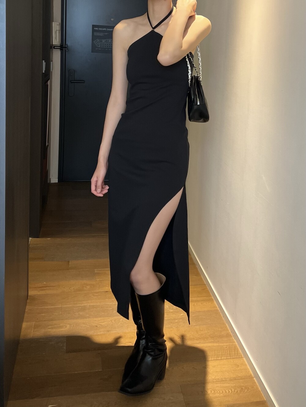 전체적으로 슬림하게 잡아주는 핏이라 허리라인을 날씬하게 잡아주고, 홀터 넥 스트랩으로 어깨 라인까지 전체적으로 페미닌하면서 시크하게 강조할 수 있는 포인트가 돋보이는 아이템입니다.