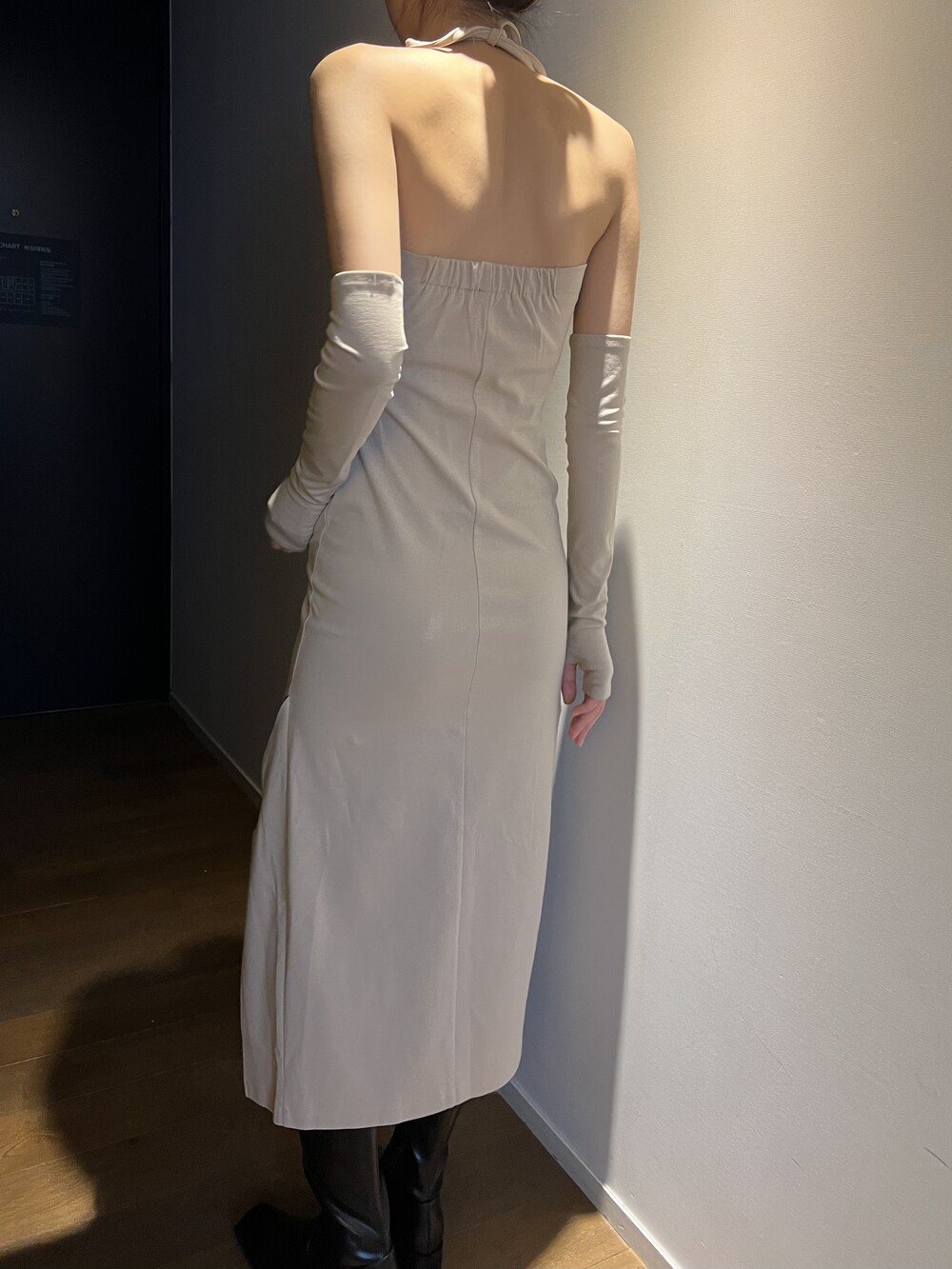 홀터 끈으로 네크에 고정하고, 뒷 밴딩으로 딱 잡아주는 홀터 원피스입니다.