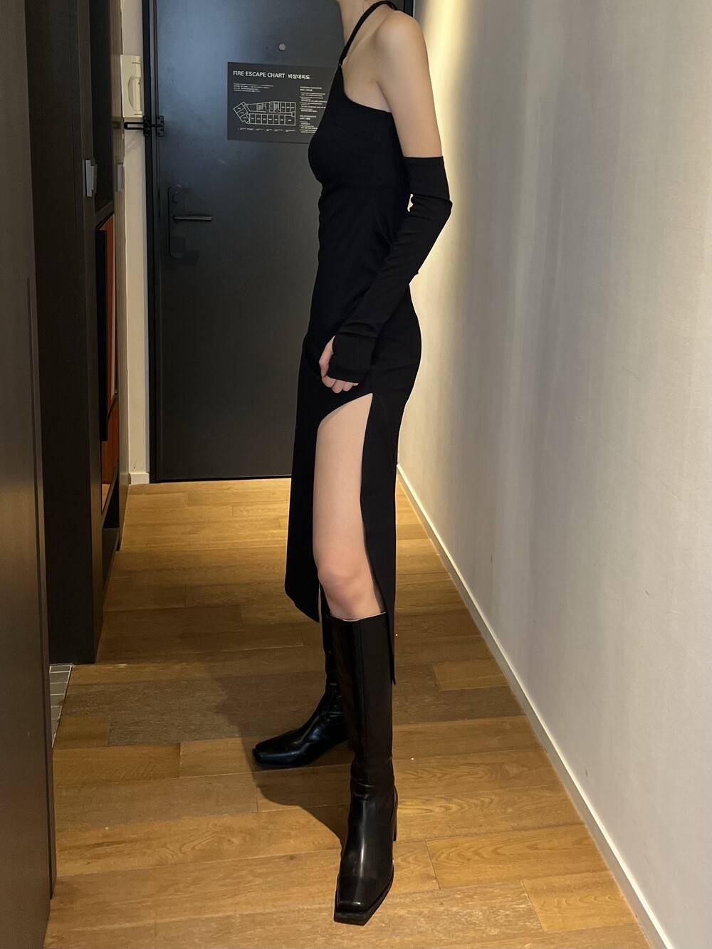 사이드에 슬릿 포인트가 있어 다리라인을 더욱 날씬하게 드러내주는 실루엣입니다.