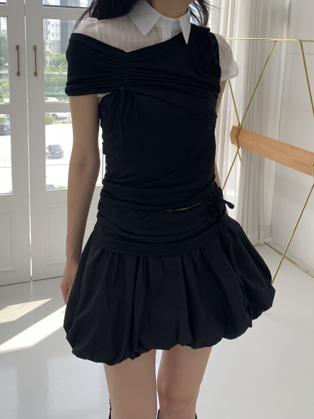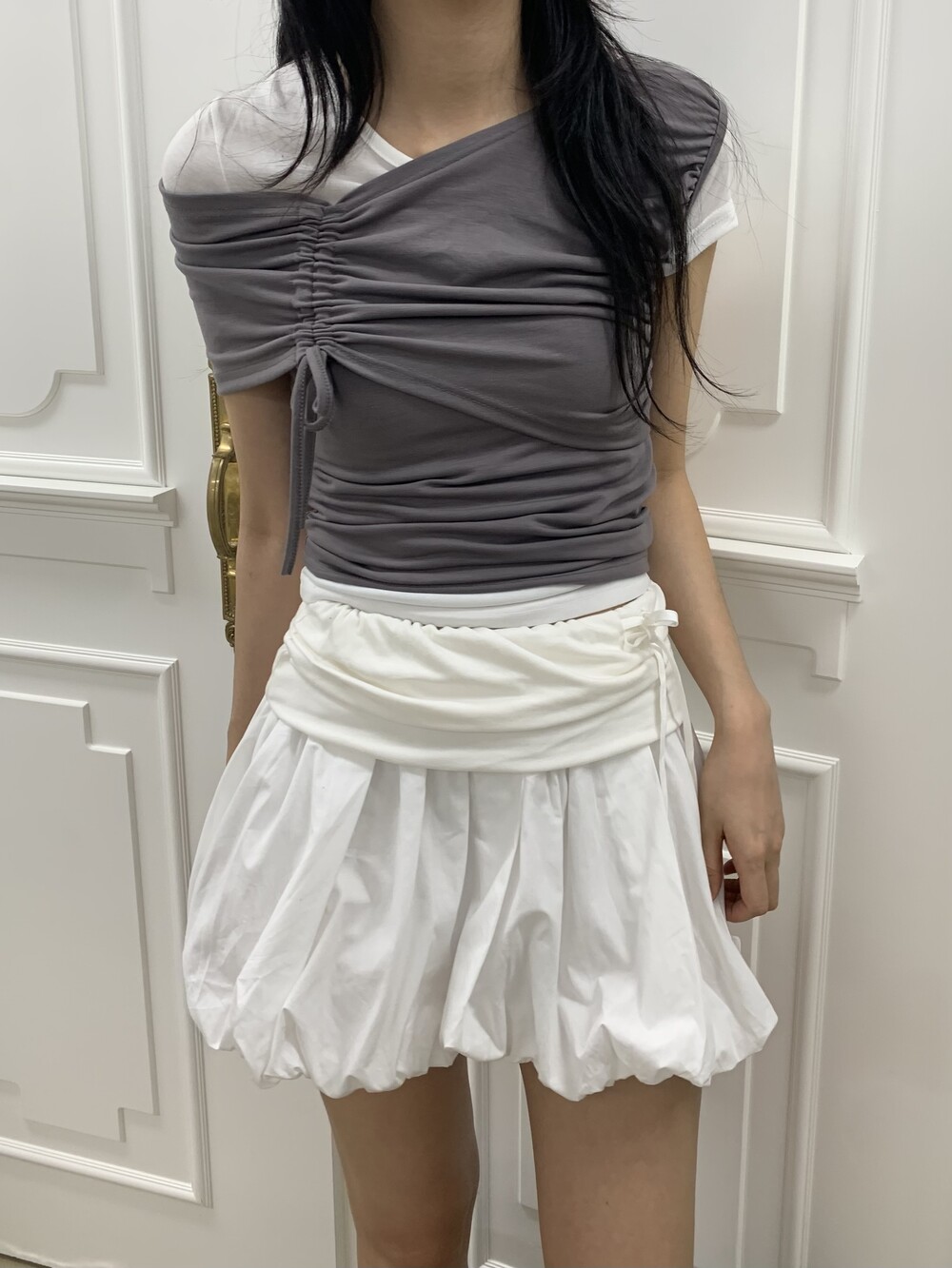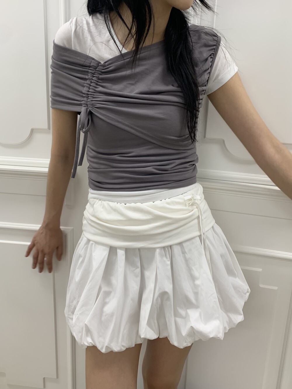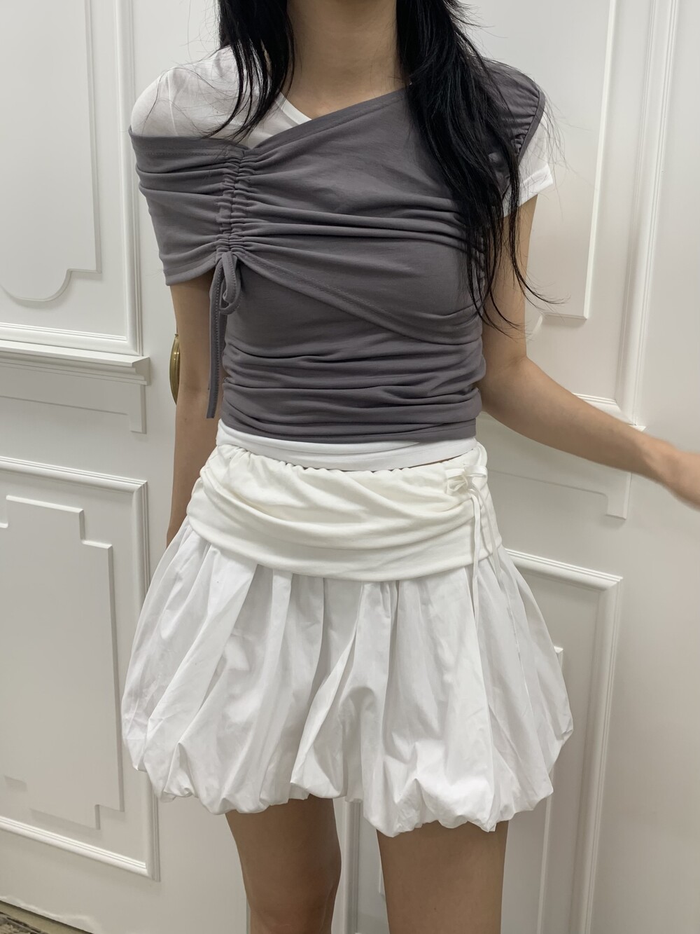 - 허리라인 셔링 레이어드 아더 원단 디테일
