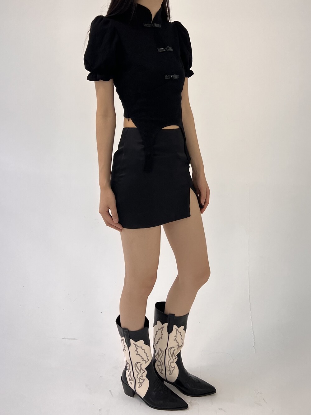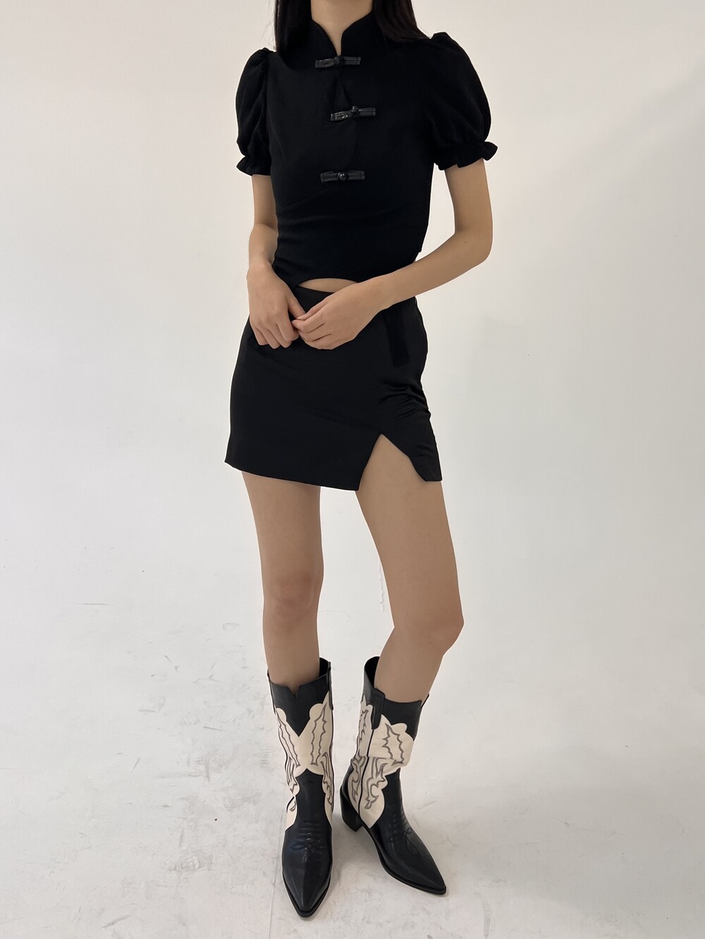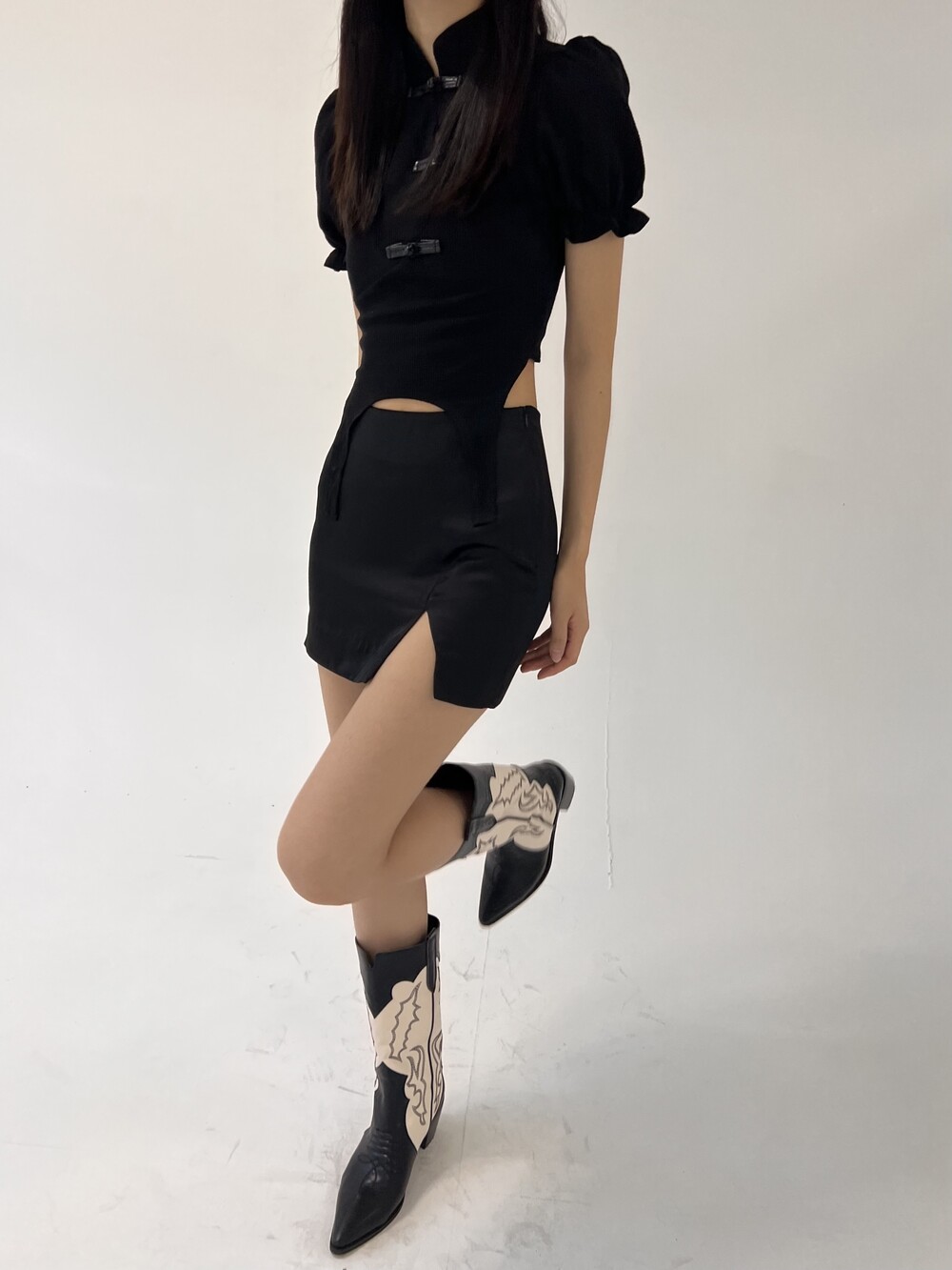 스티치 자수 디테일이 예쁜 흔하지 않는 디자인의 미들부츠입니다.