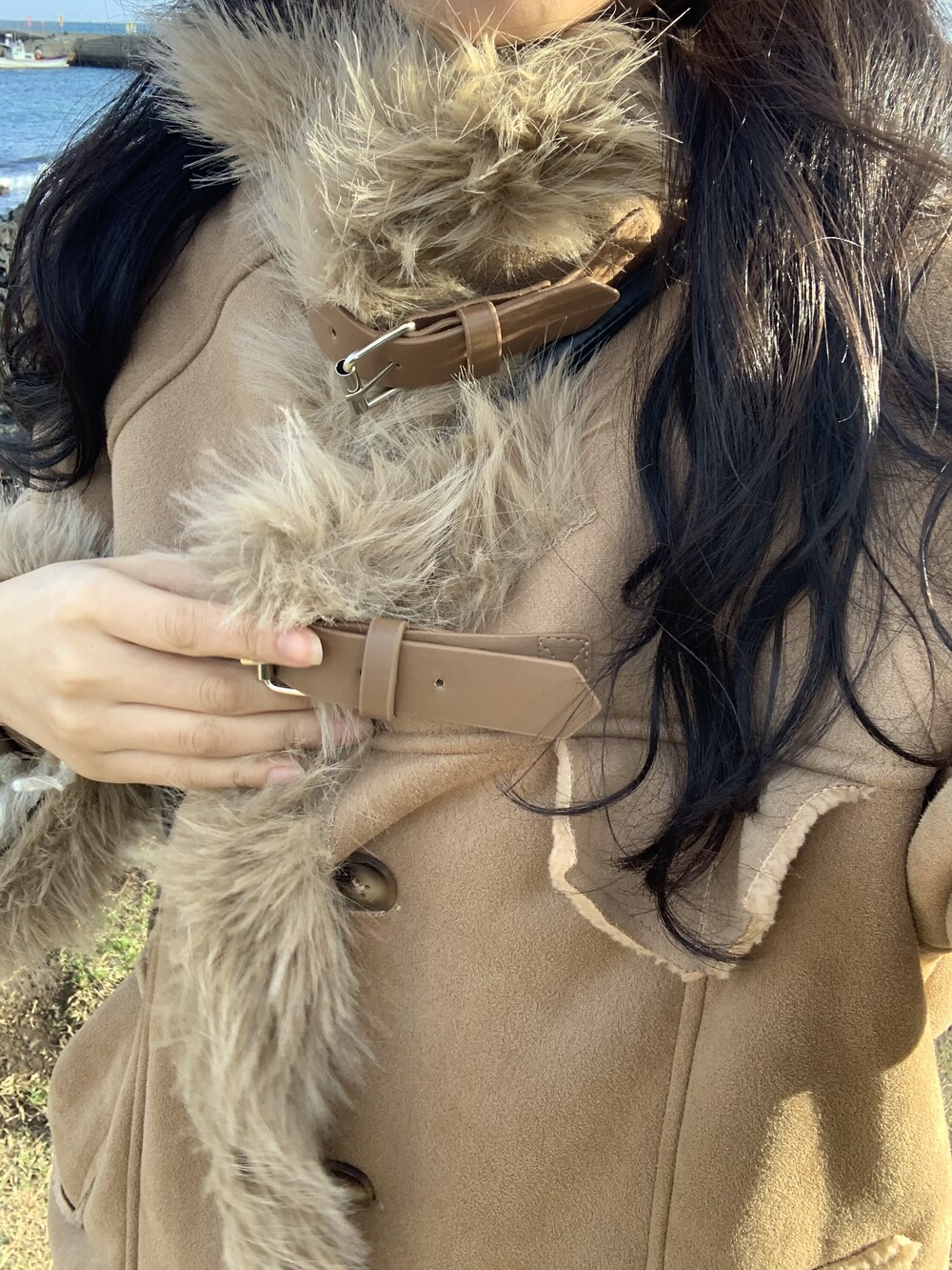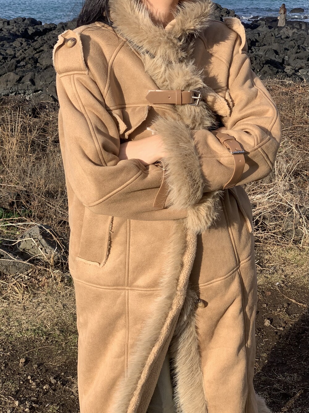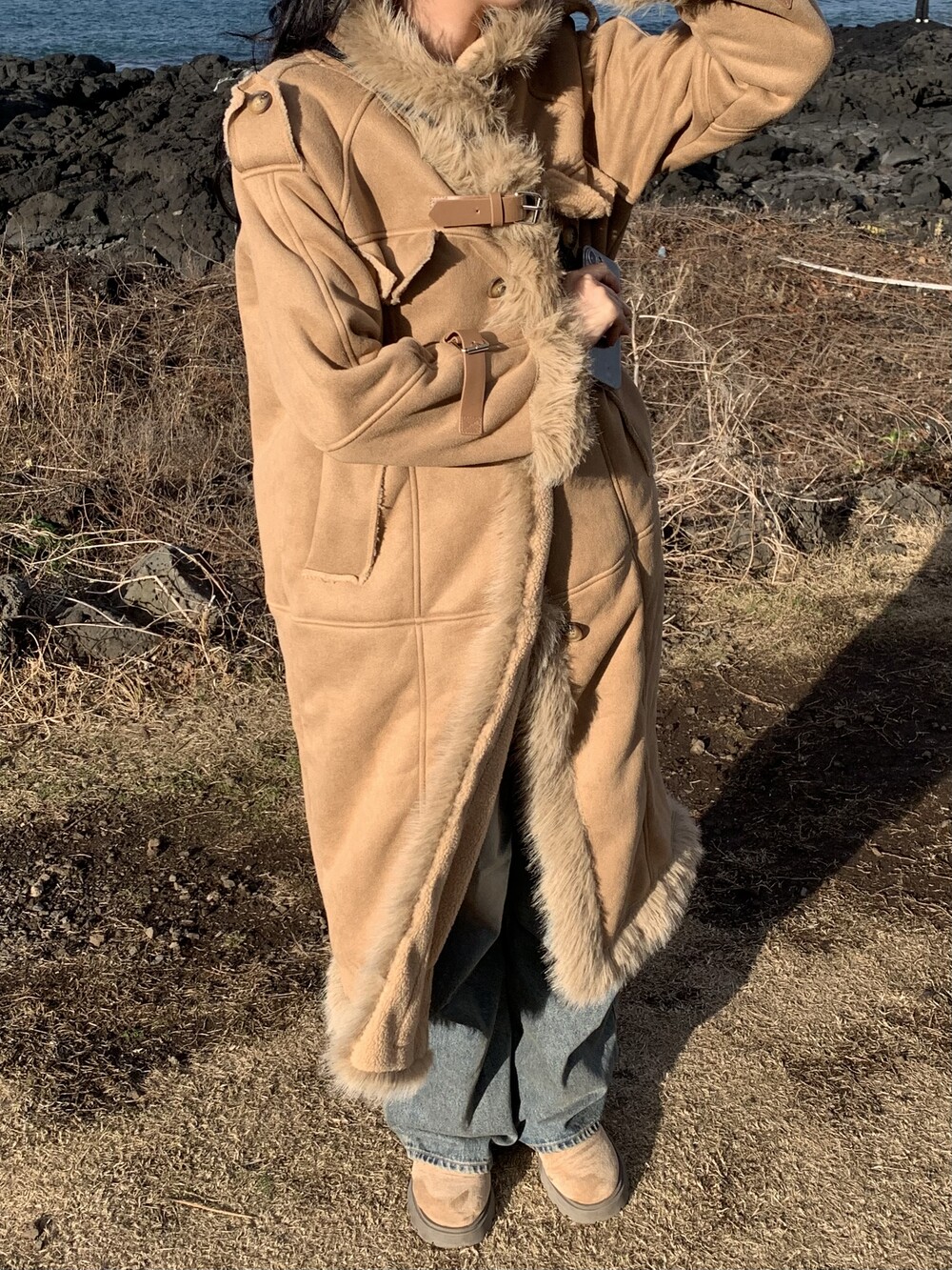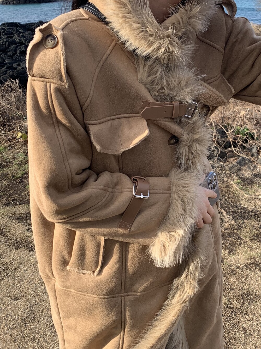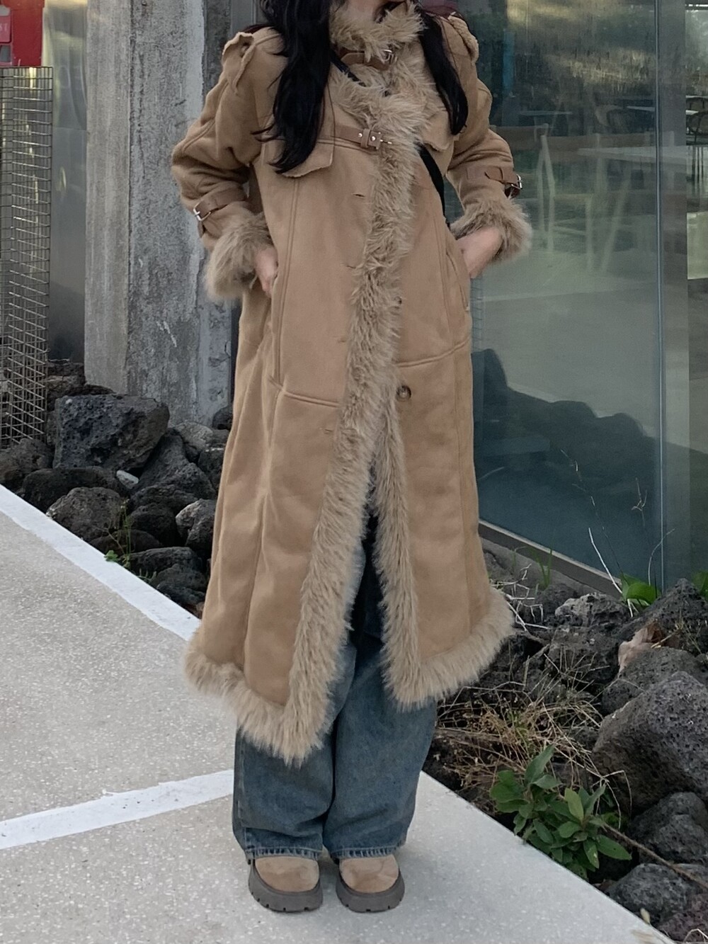 suede fur belt long coat