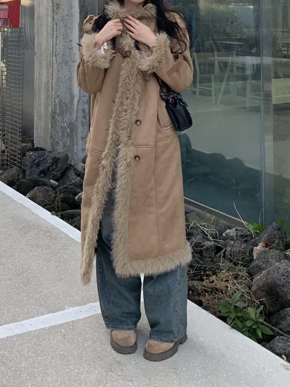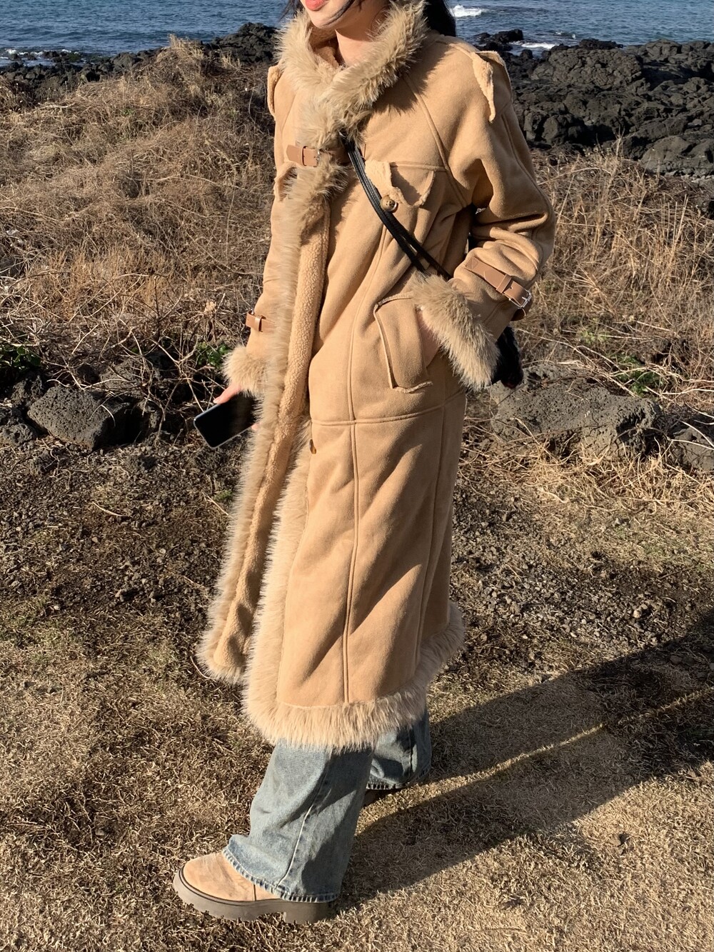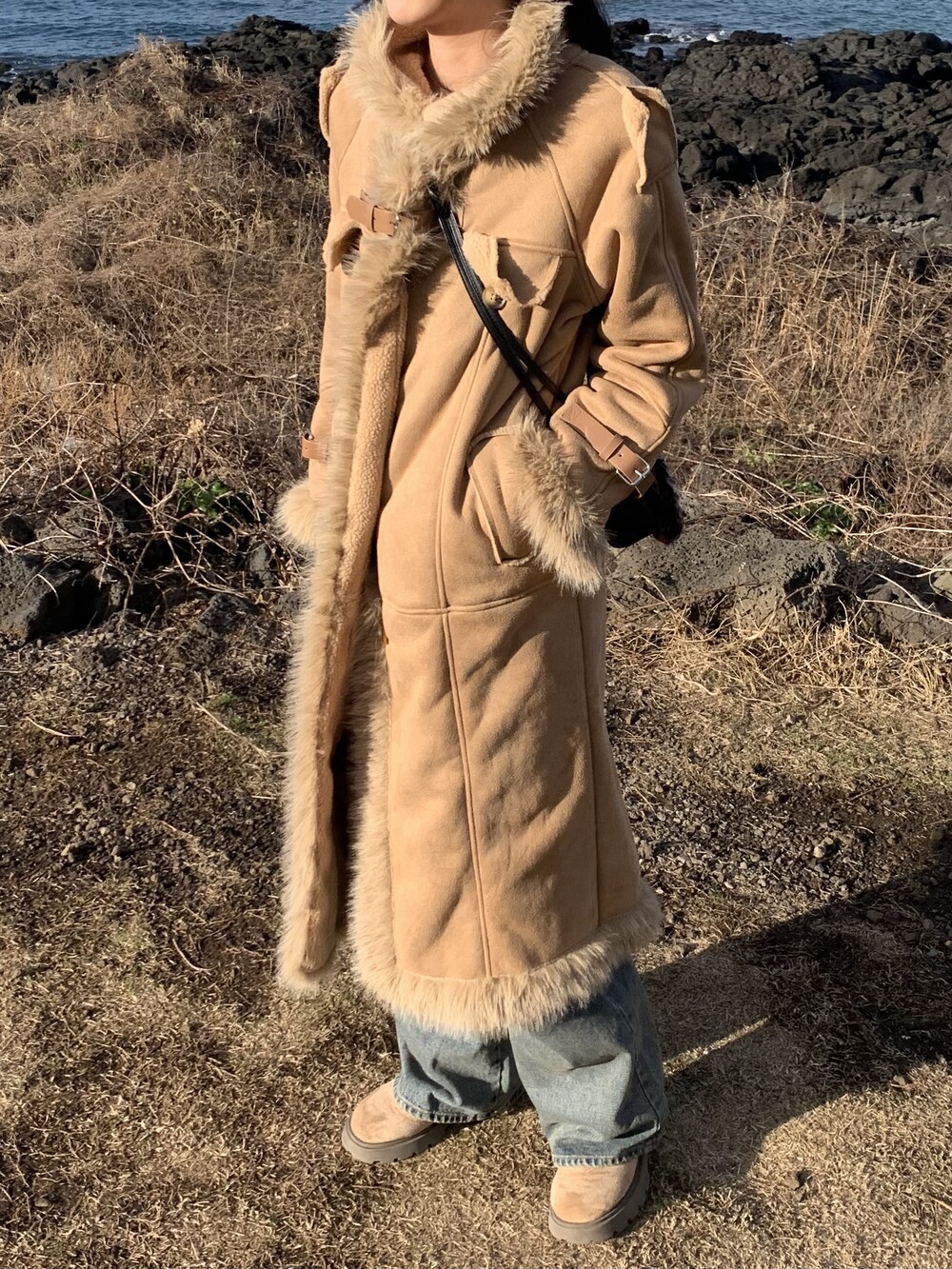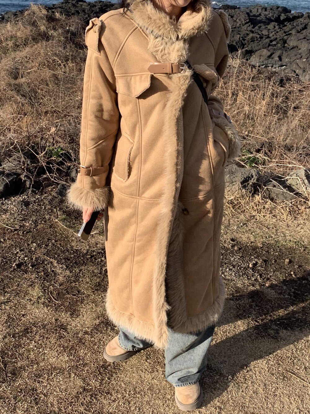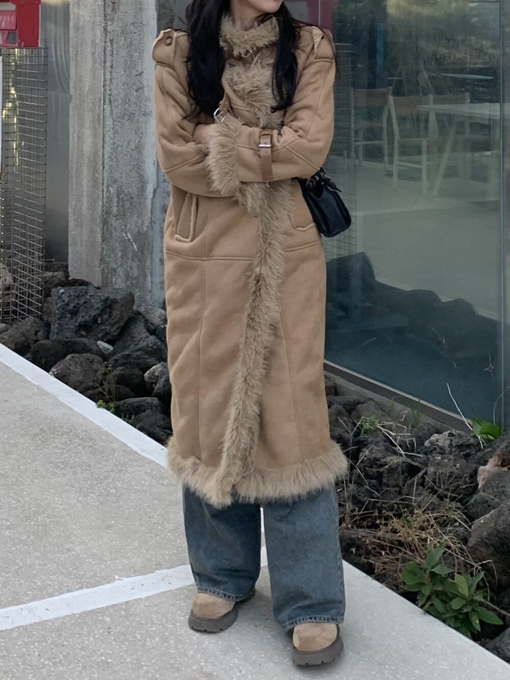 suede fur belt long coat