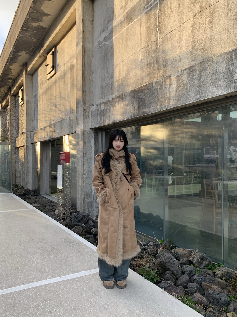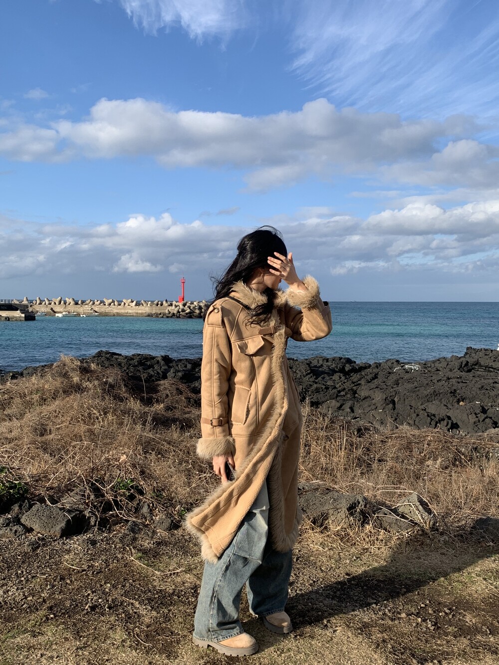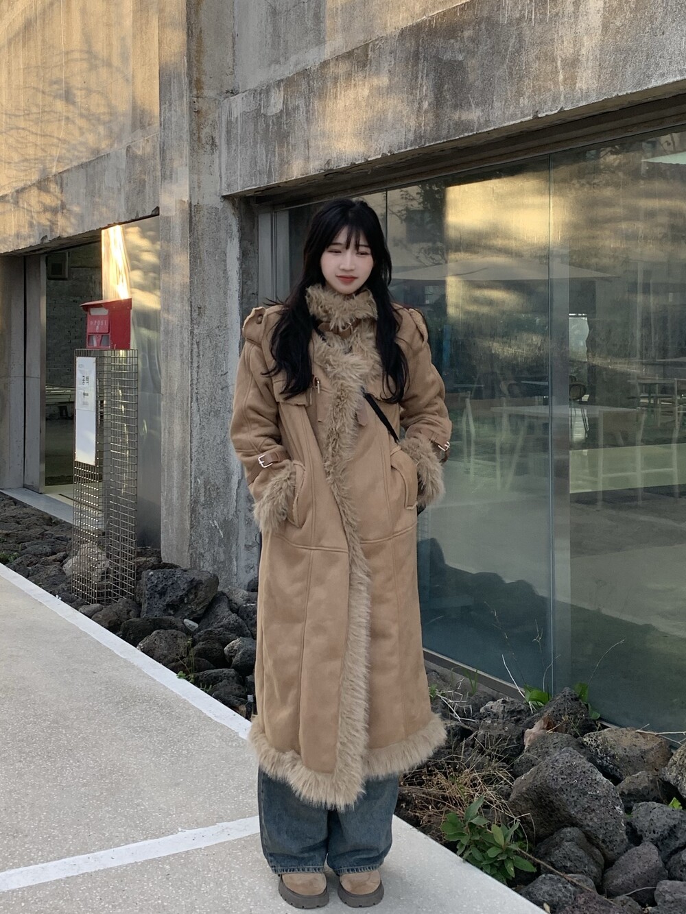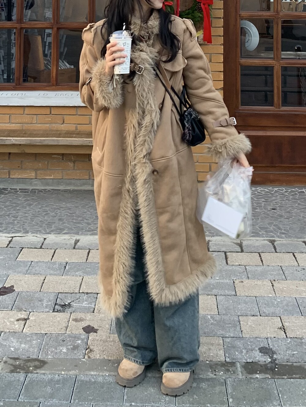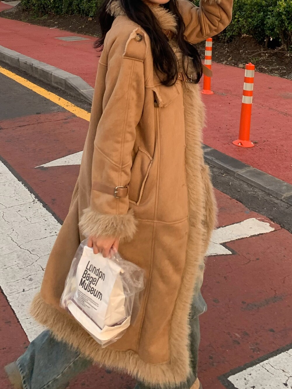 suede fur belt long coat