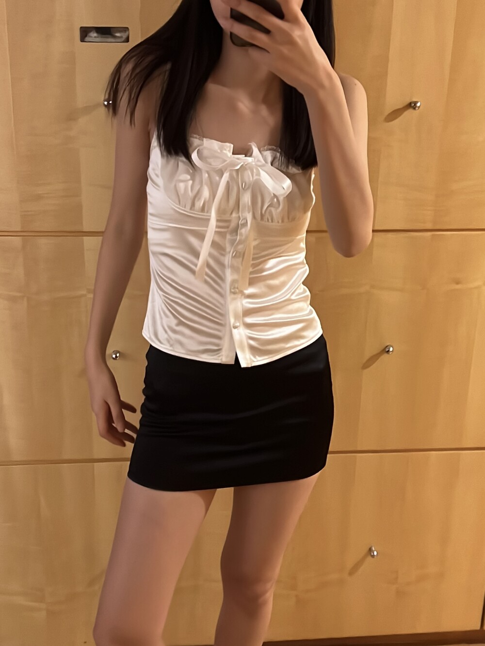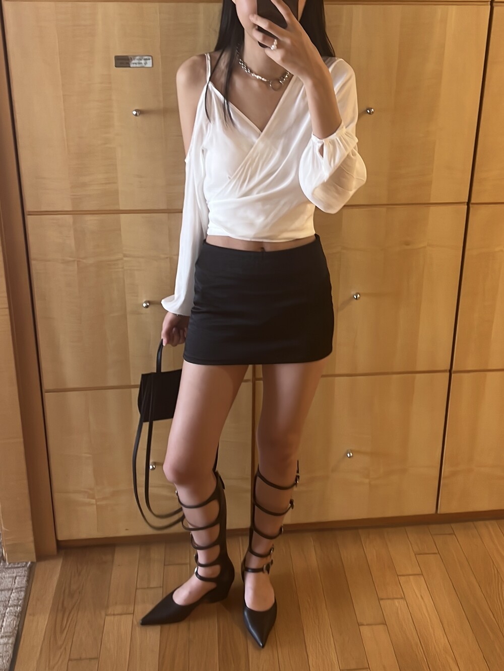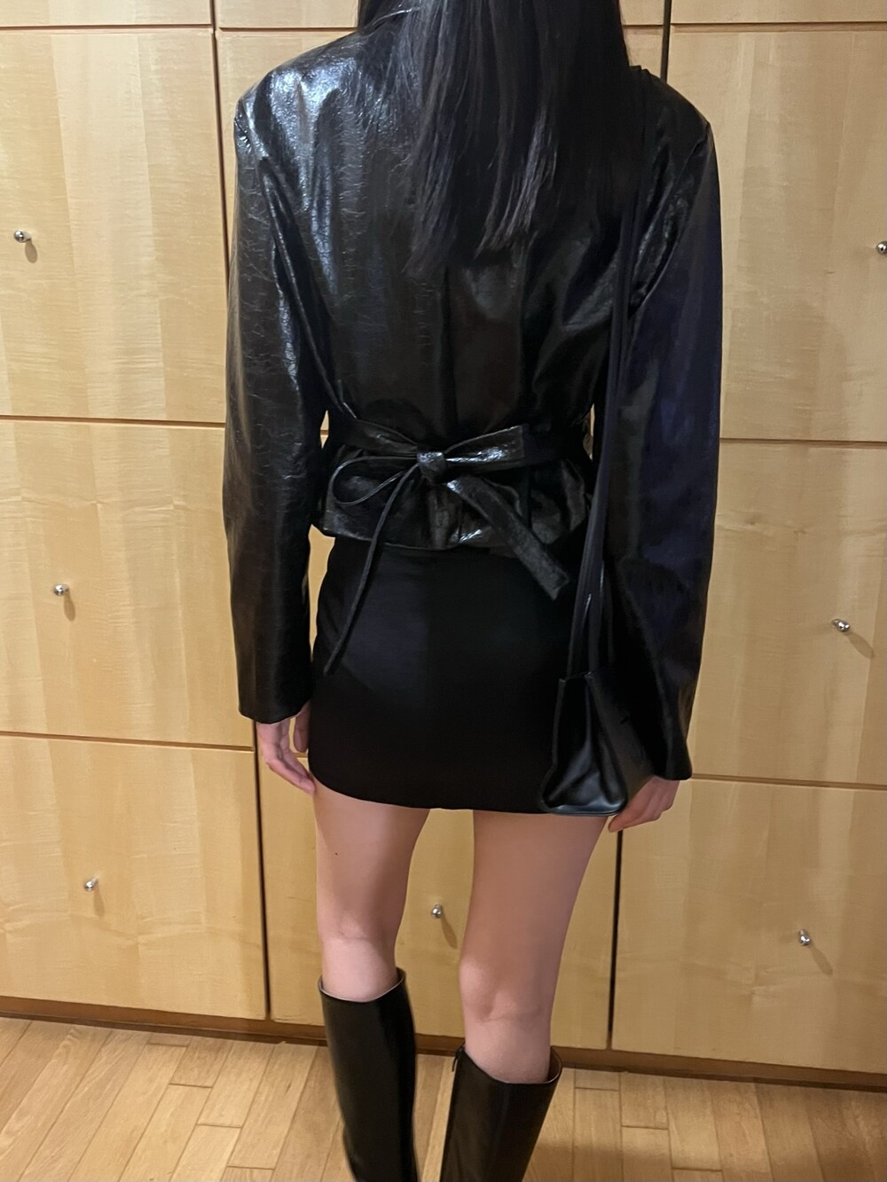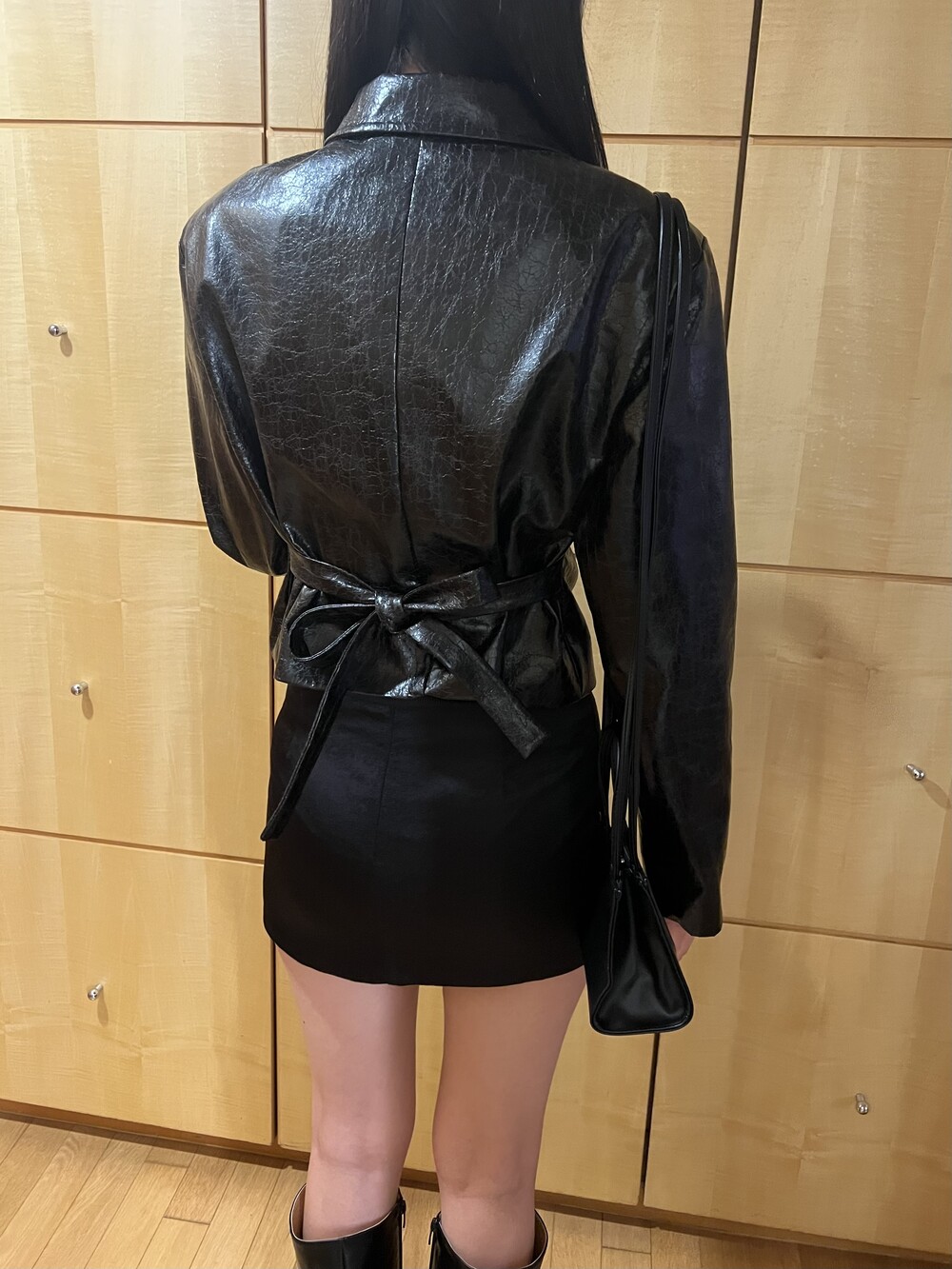 허리라인을 부드럽게 감아주며, 크랙 디테일이 있는 새틴 합포소재로 핏을 딱 잡아주어