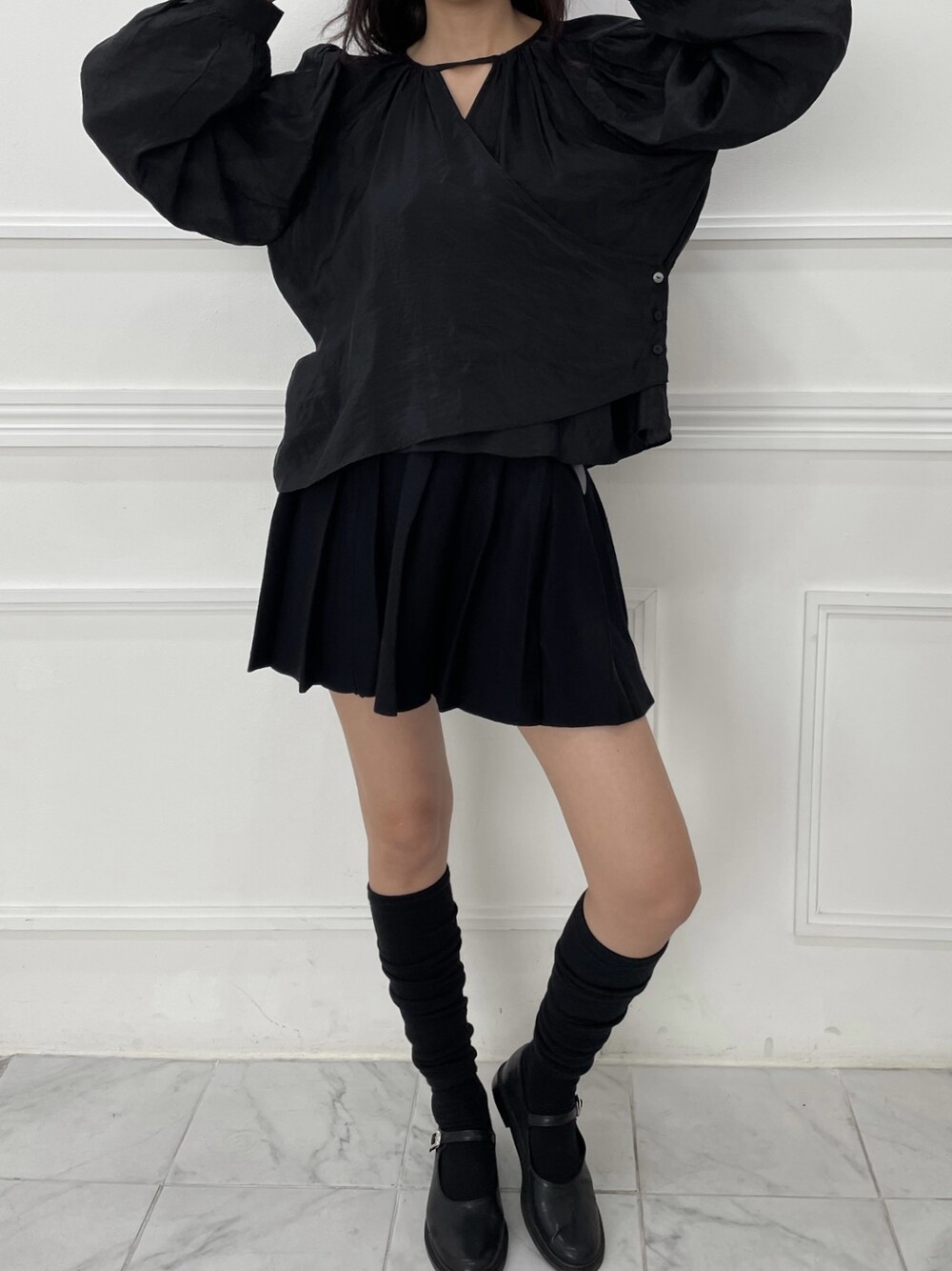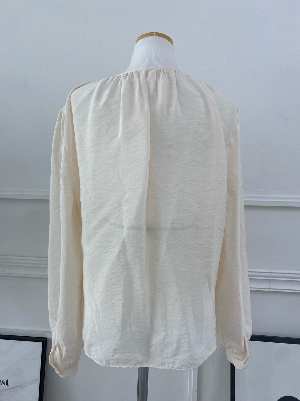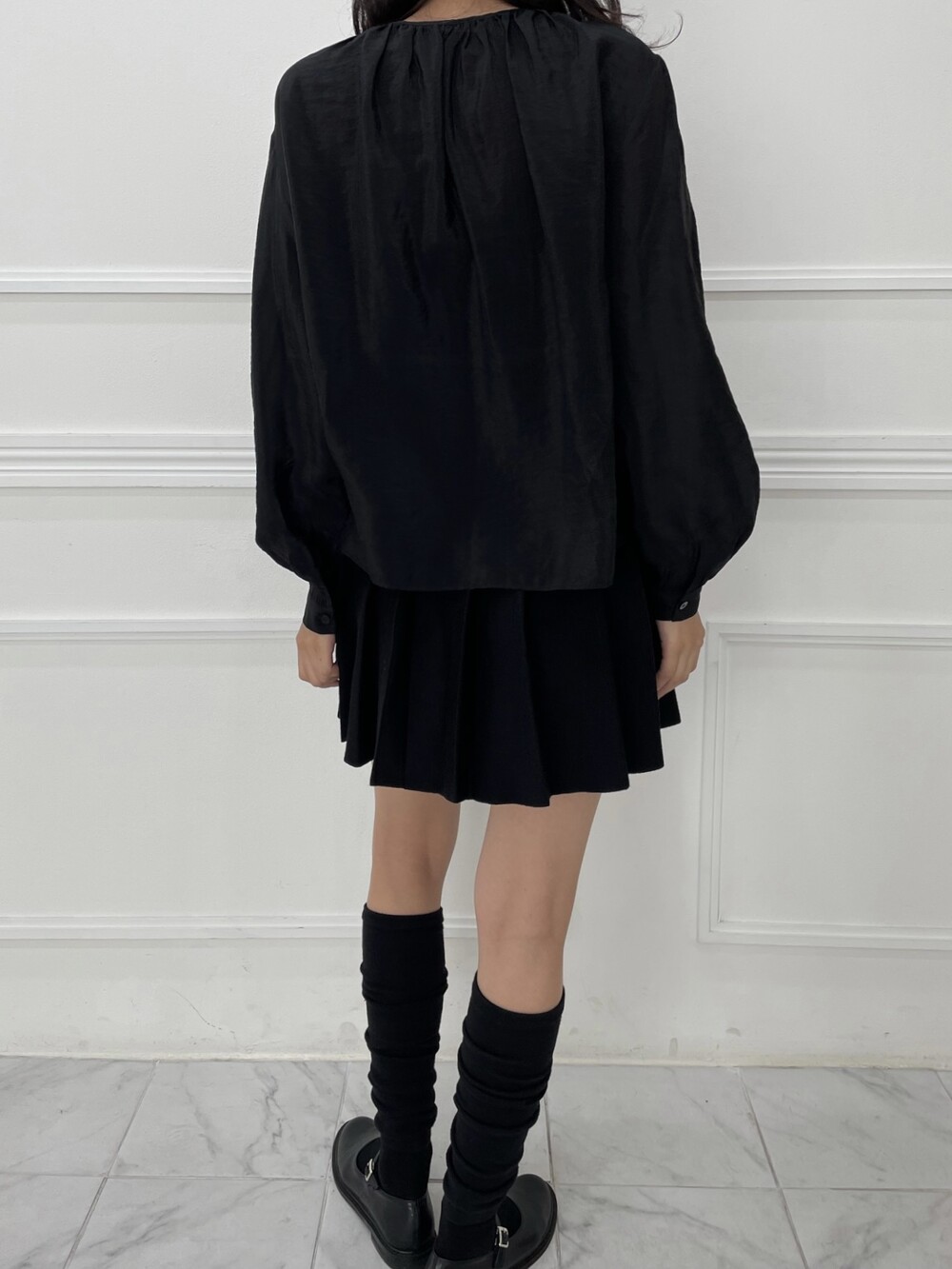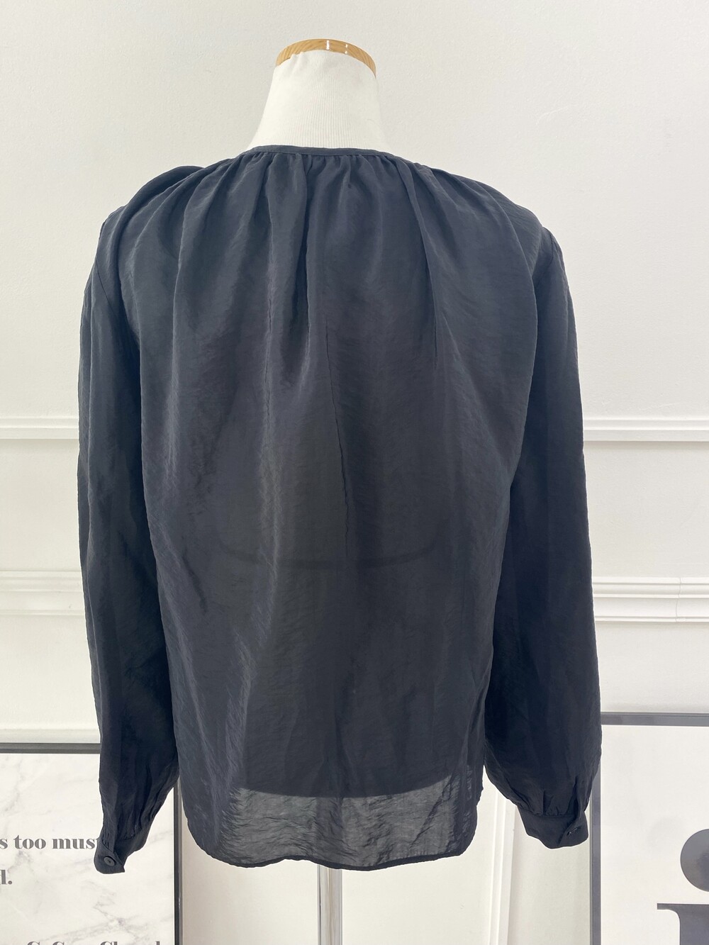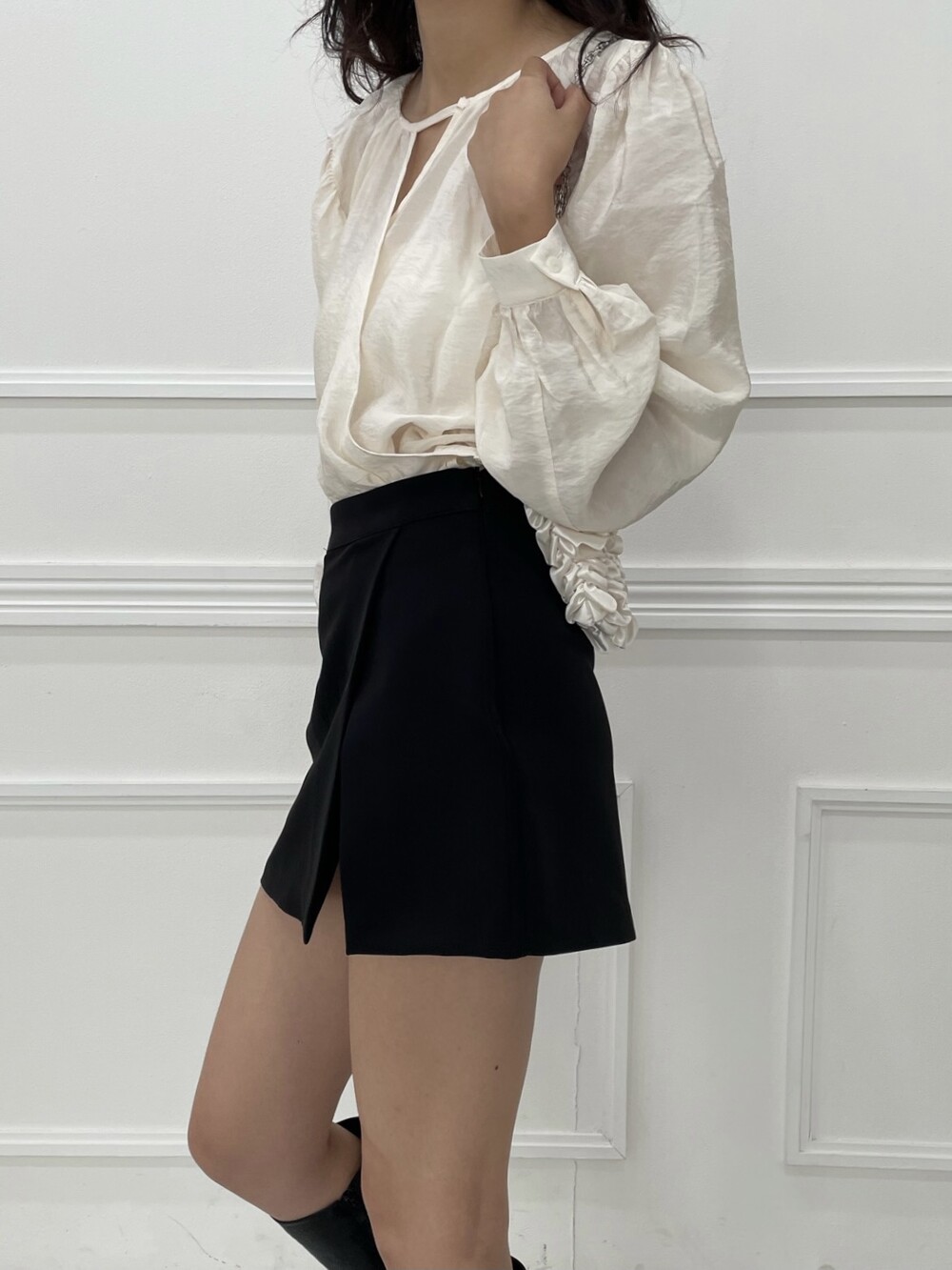 은은한 광택이 도는 새틴 원단에 네크라인 셔링 부터 소매 퍼프까지 , 소재며 디테일이며 퀄리티가 매우 좋은 아이템입니다. 선선한 바람이 부는 요즘 가을 날에 데이트룩으로 입으셔도 딱 좋은 블라우스입니다.