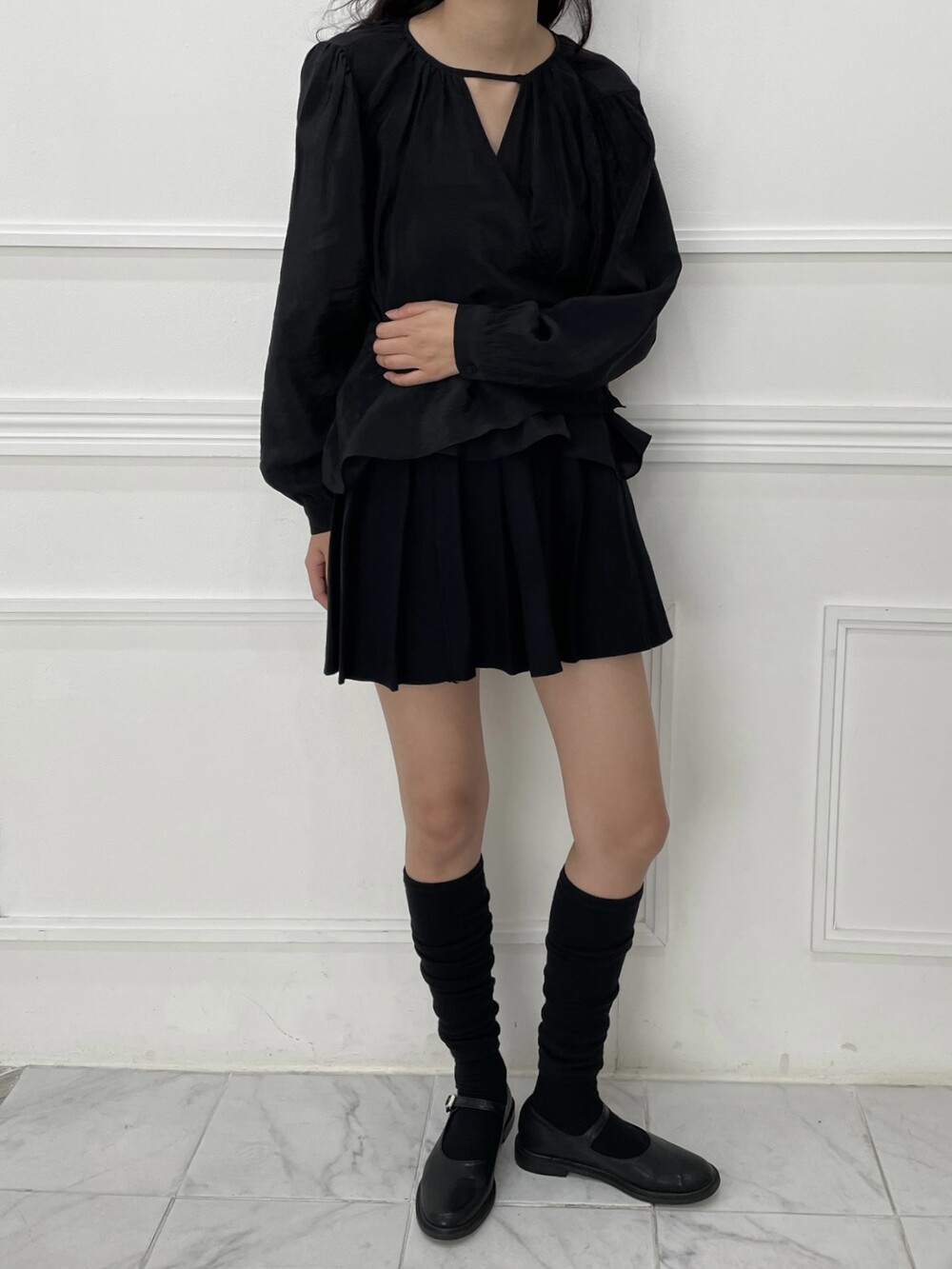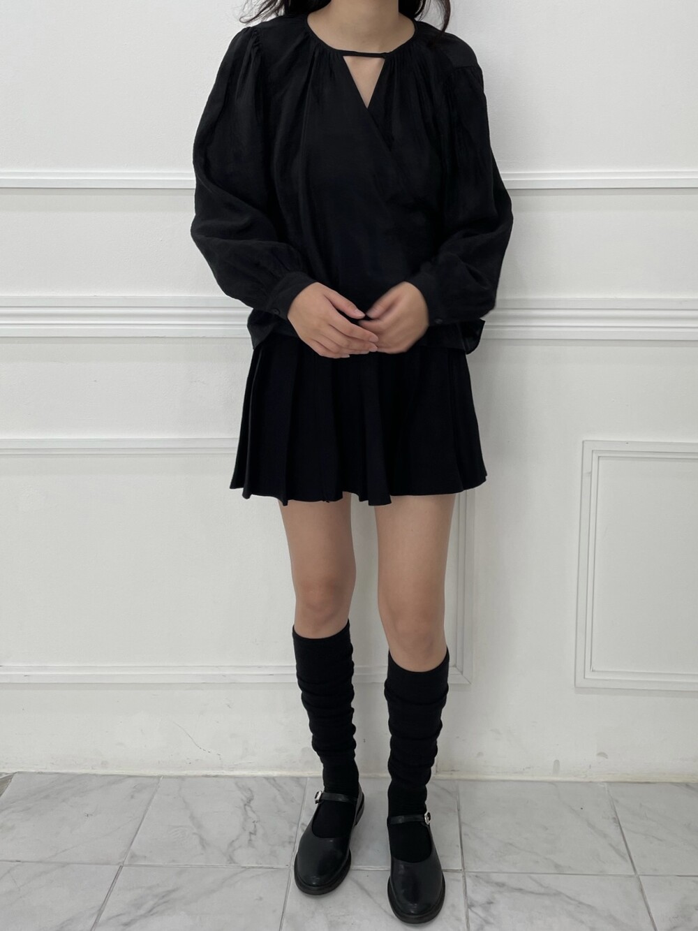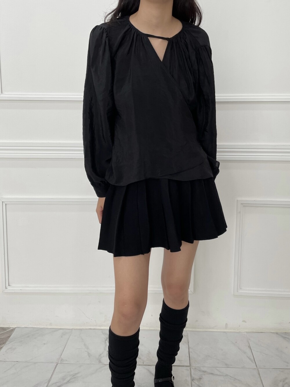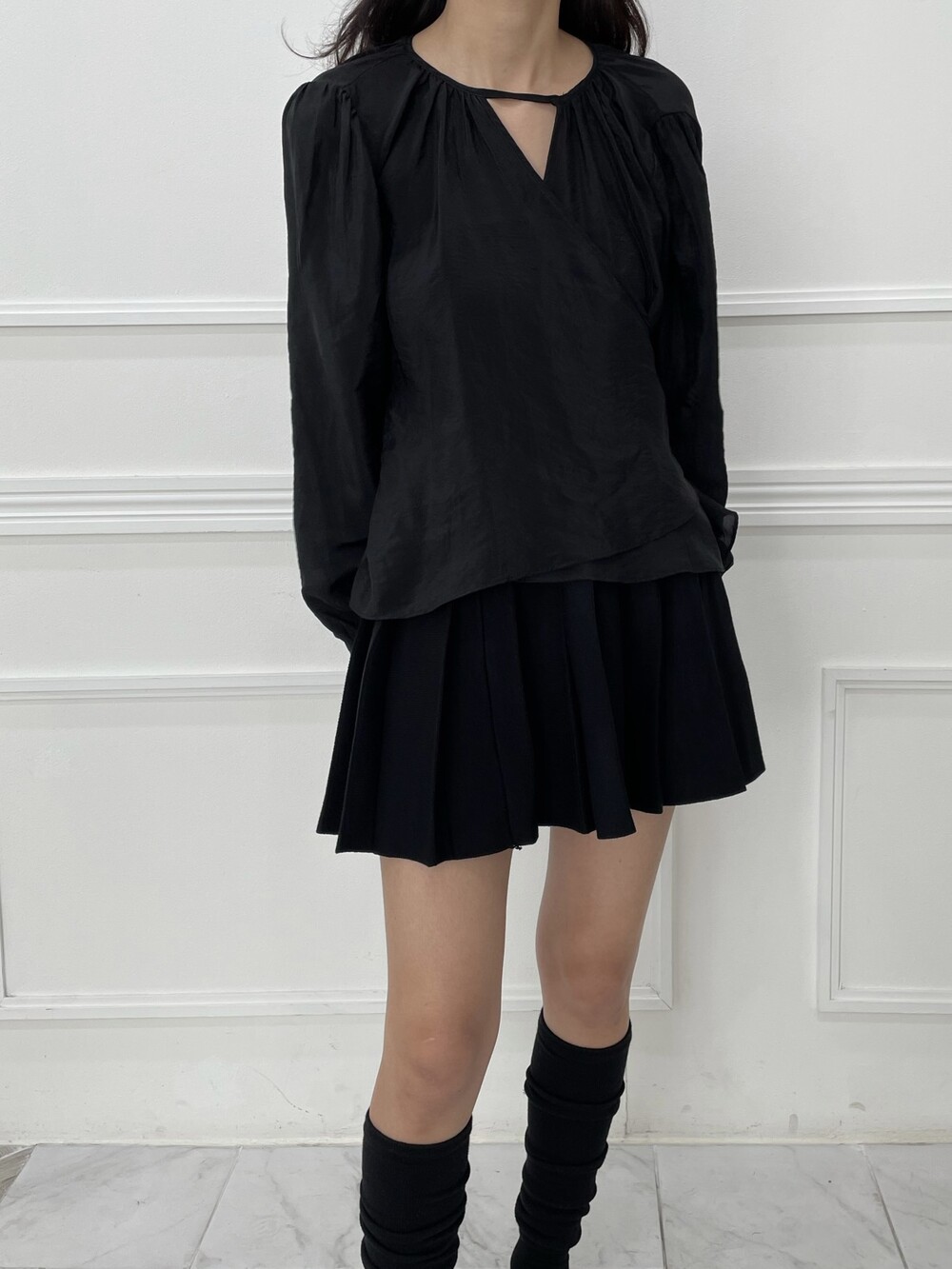 은은한 광택이 도는 새틴 원단에 네크라인 셔링 부터 소매 퍼프까지 , 소재며 디테일이며 퀄리티가 매우 좋은 아이템입니다. 선선한 바람이 부는 요즘 가을 날에 데이트룩으로 입으셔도 딱 좋은 블라우스입니다.
