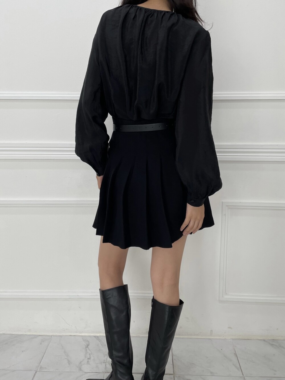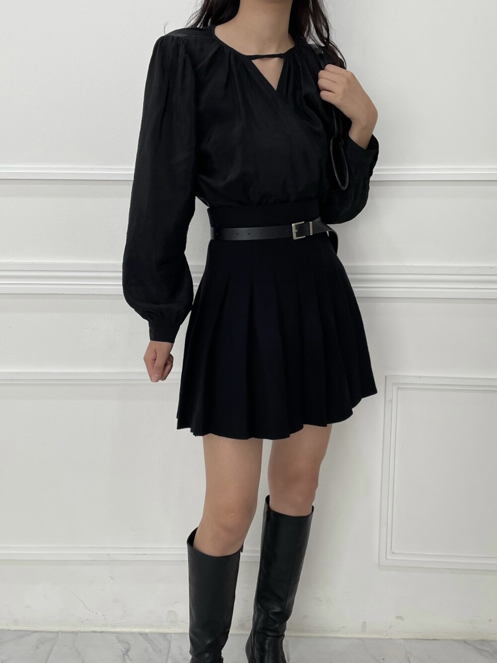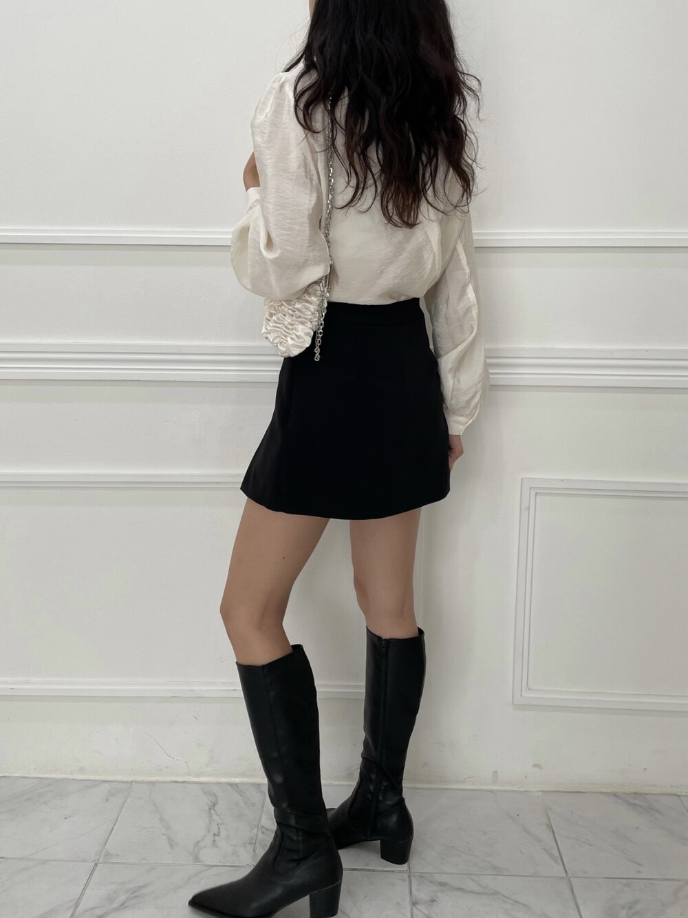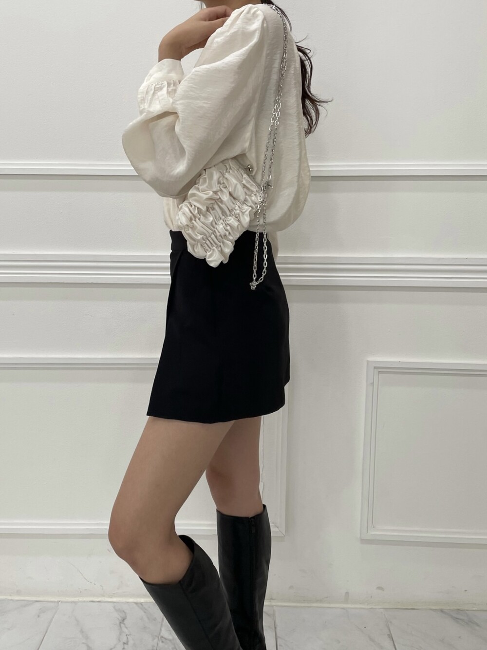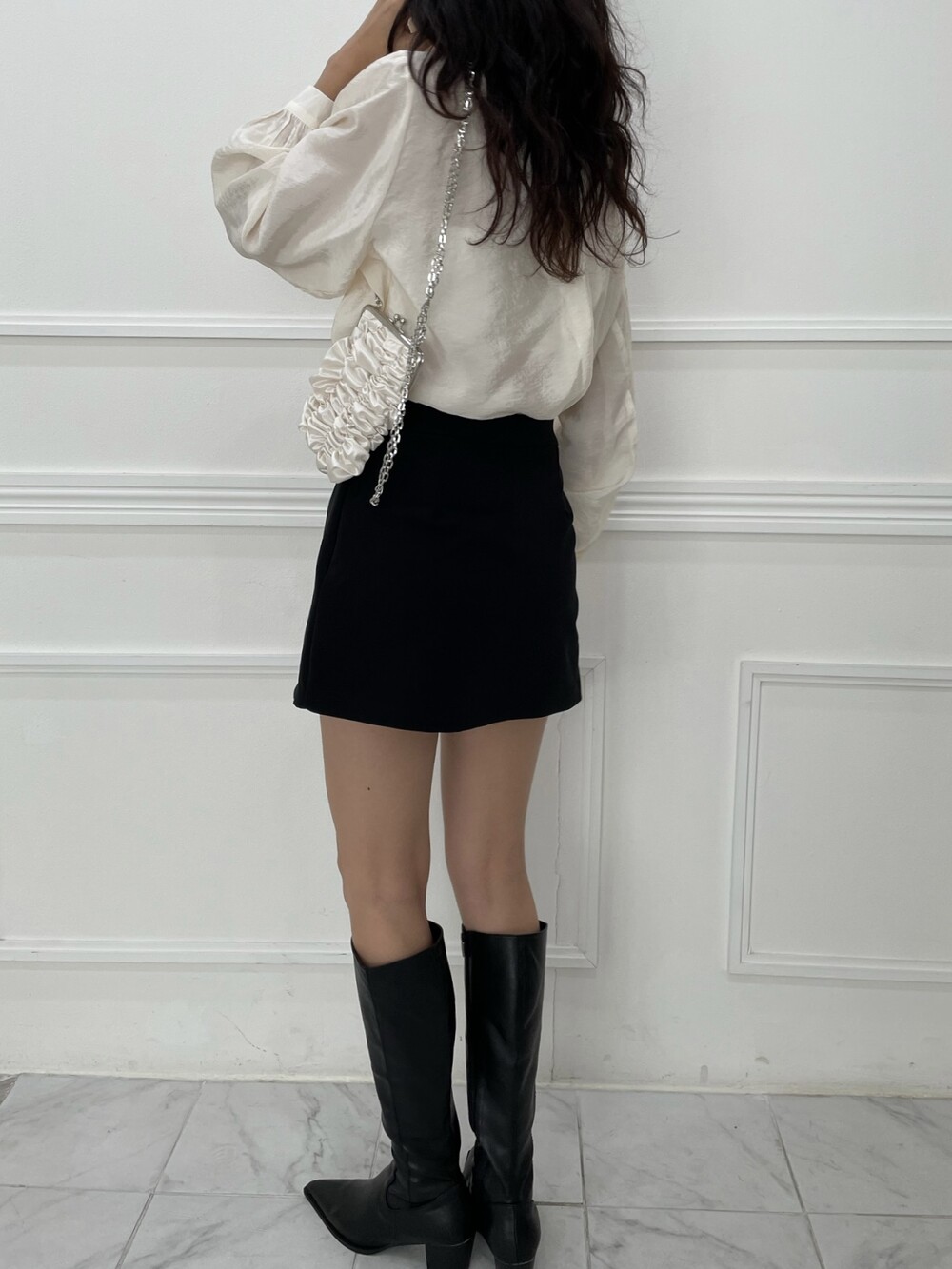 은은한 광택이 도는 새틴 원단에 네크라인 셔링 부터 소매 퍼프까지 , 소재며 디테일이며 퀄리티가 매우 좋은 아이템입니다. 선선한 바람이 부는 요즘 가을 날에 데이트룩으로 입으셔도 딱 좋은 블라우스입니다.