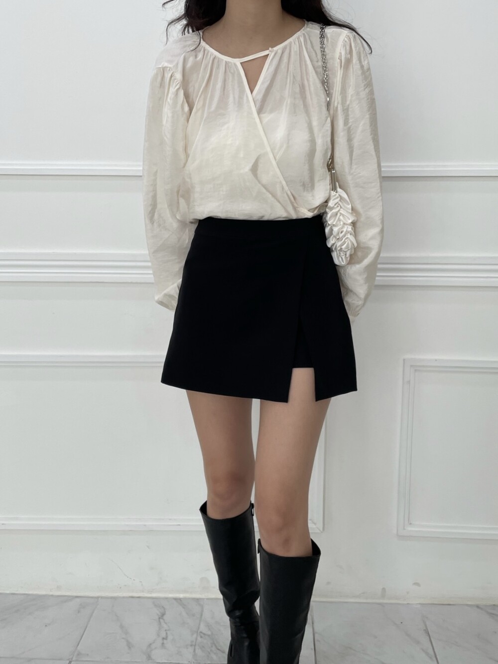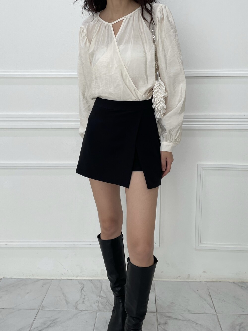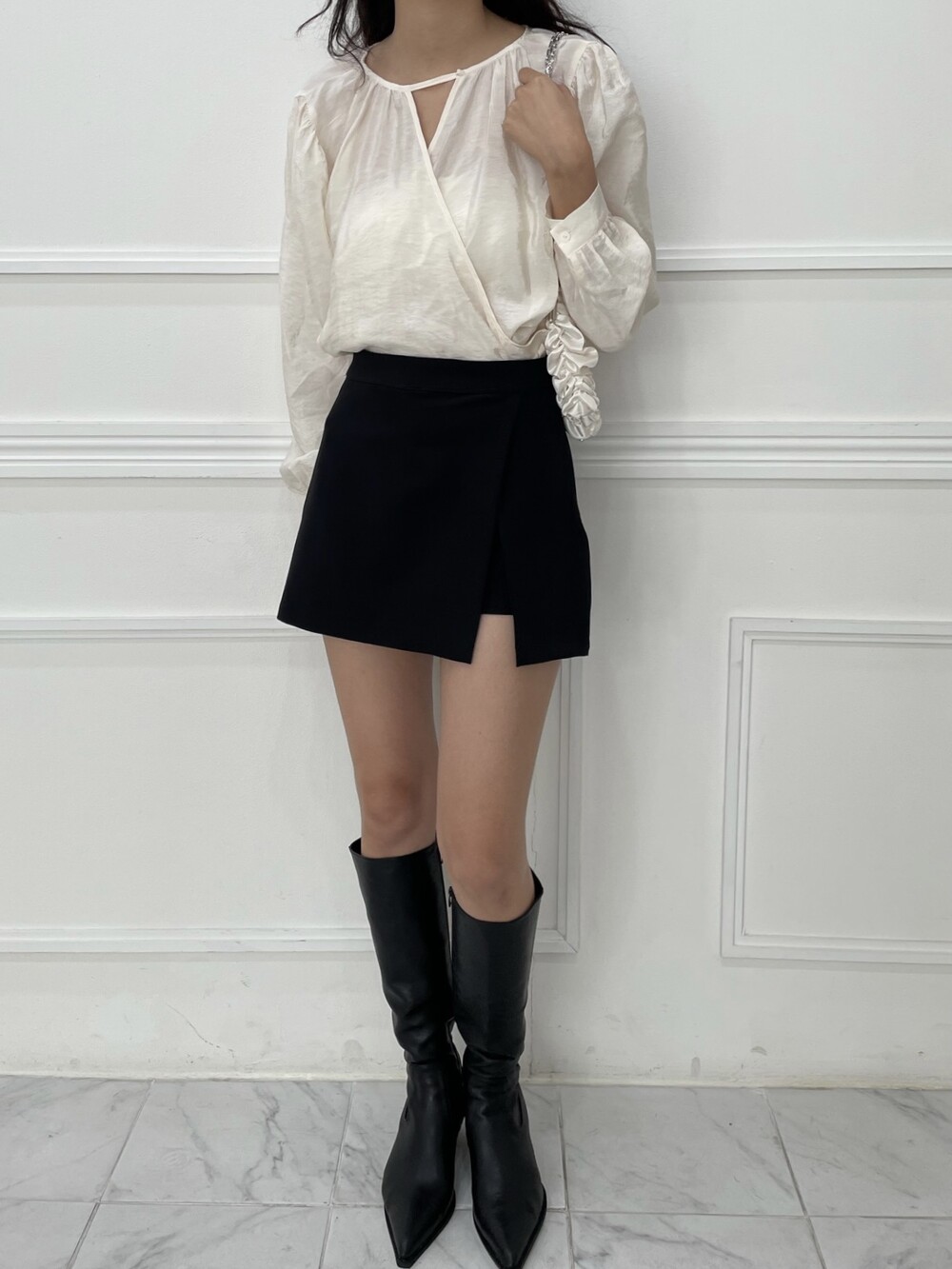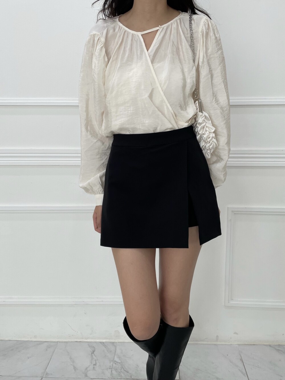 네크라인의 단추 버클로 브이넥 랩 블라우스로도 착용이 가능하고, 좀 더 단정하게 버클을 채워 부담스럽지 않고 페미닌한 분위기 연출도 가능합니다. 아이보리 컬러감도 쨍한 화이트컬러가 아니라 은은하게 도는 광택으로 과하지 않으면서 단독으로 스커트나 팬츠와 매치하여도 매우 센스있는 코디가 가능한 아이템입니다.