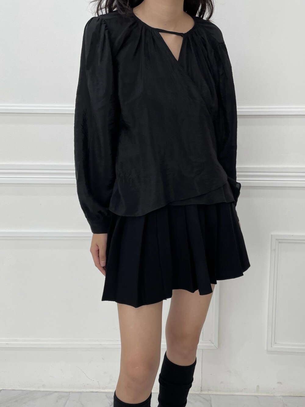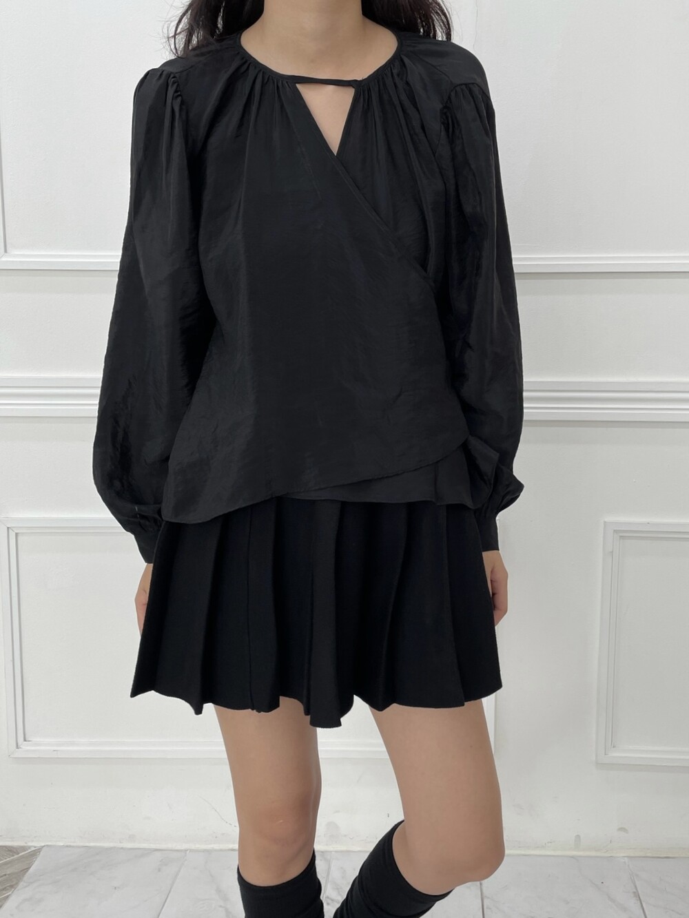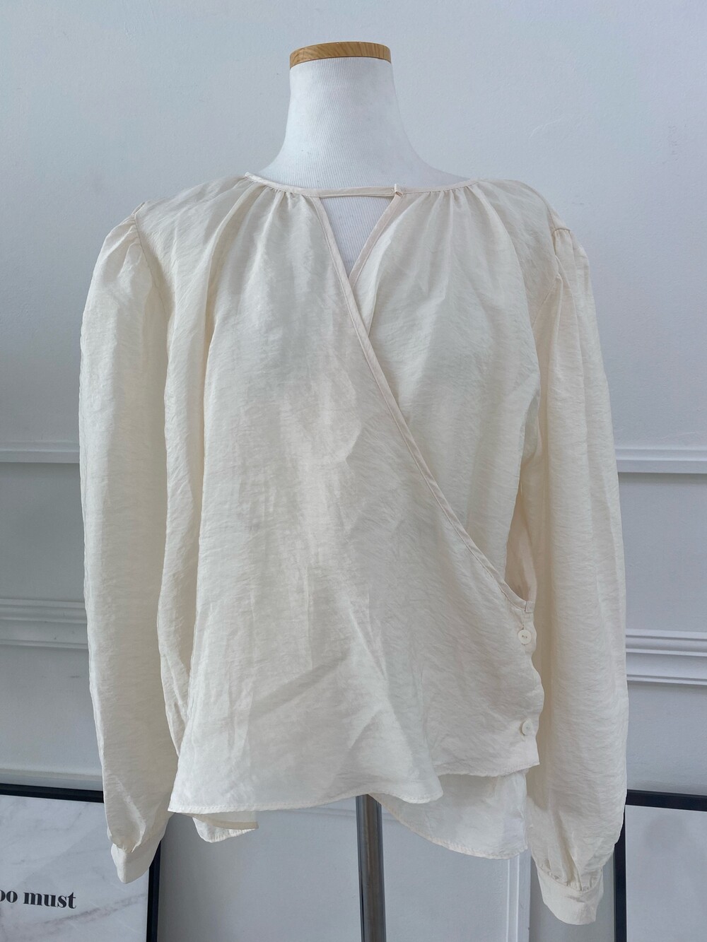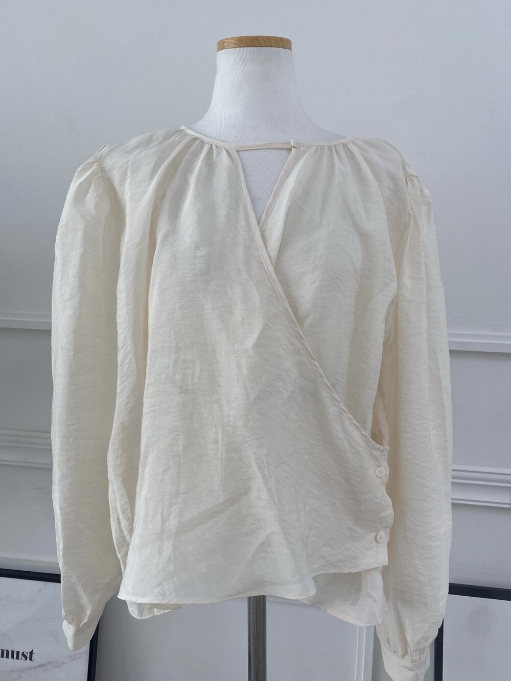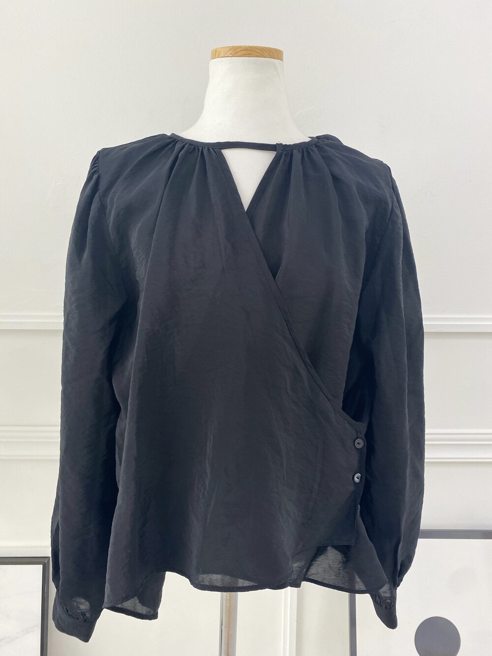 고급스러운 새틴 소재의 랩 블라우스.